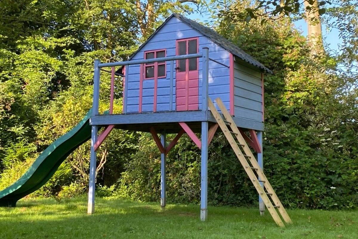 Il giardino dispone di una terrazza piastrellata, un barbecue e una casetta da gioco per i bambini.
