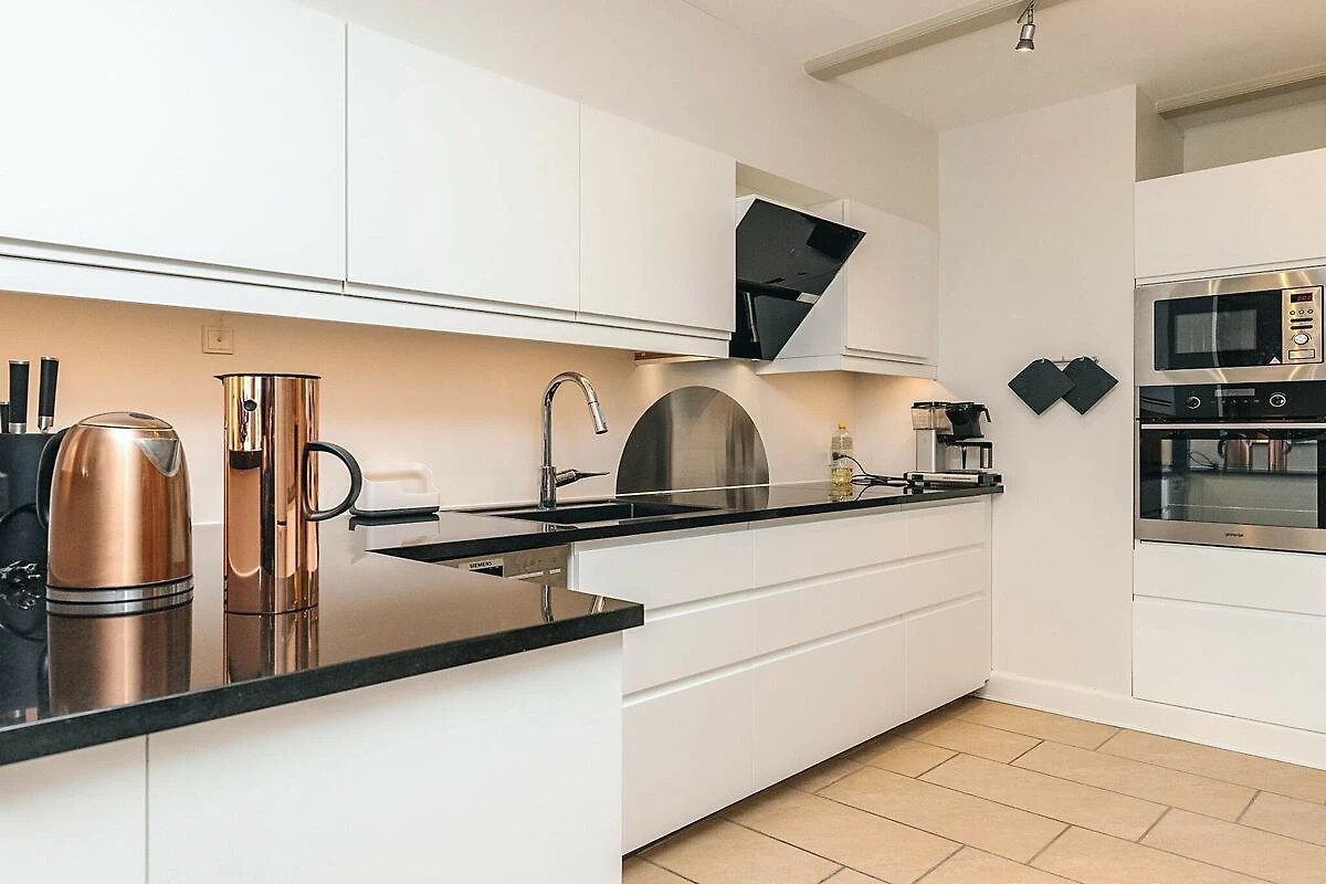 Cucina separata(mobile cucina(2 fuochi), caffettiera, forno, forno a microonde, lavastoviglie, congelatore(1-59L), frigo con congelatore, lavabo), Soggiorno/camera da letto(TV, chromecast), Camera da letto(letto matrimoniale), Camera da letto(letto matrimoniale), Bagno(lavabo, doccia, WC), Bagno(asciugabiancheria, lavabo, doccia, WC, lavatrice), riscaldamento(autonomo), terrazza, mobili da giardino, lettini prendisole