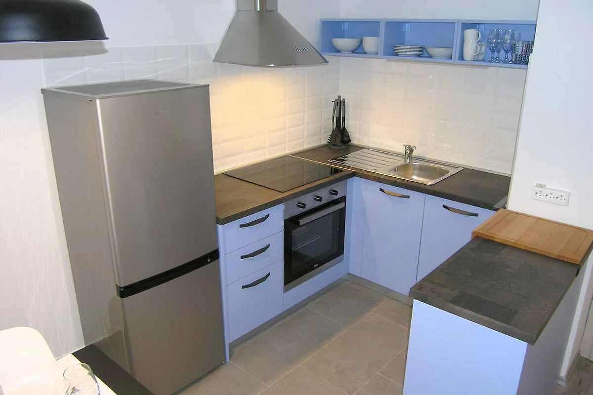 Soggiorno con 1 letto aggiuntivo su divano/sofa. Camera da letto (14 mq) con 1 letto matrimoniale e accesso al balcone. Angolo cucina nel soggiorno con forno, frigorifero (scomparto del ghiaccio), caffettiera e piano cottura. Bagno con doccia, 1 lavandino e WC.