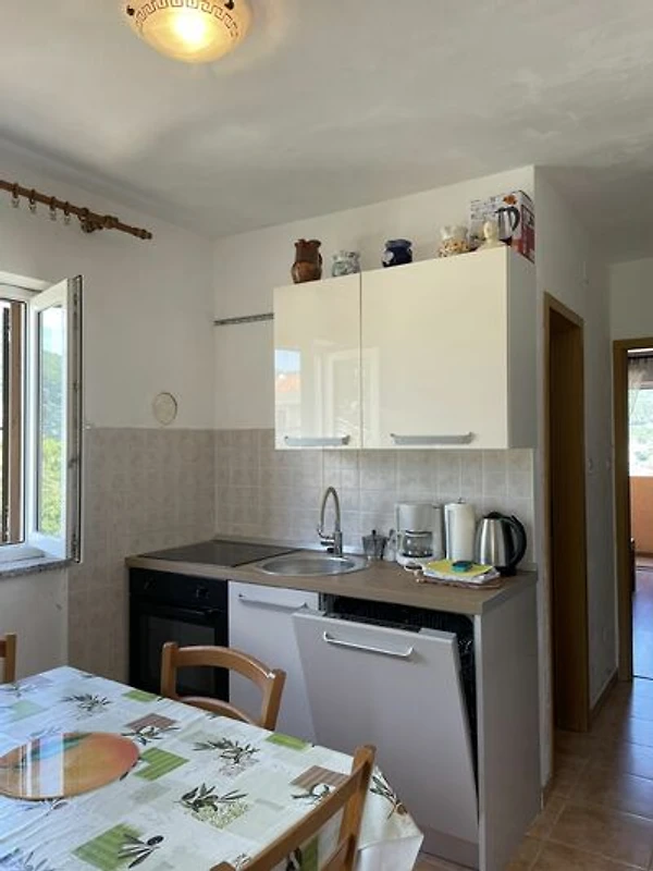 Cres. L' appartamento vacanze si trova in una trama del giardino chiuso con arbusti e alberi, delimitata da una recinzione. L'accesso avviene vicino a una strada secondaria (asfaltata). Parcheggio (per 2 auto) sulla proprietà.