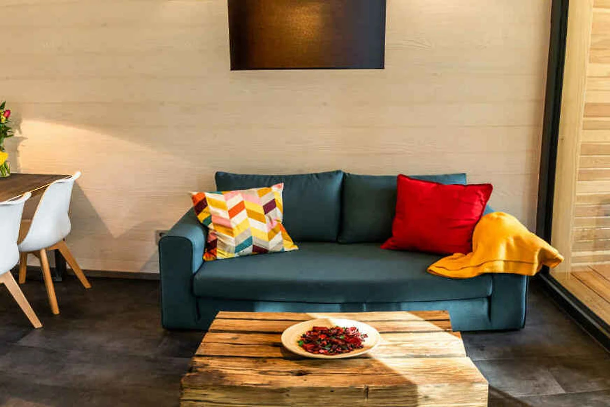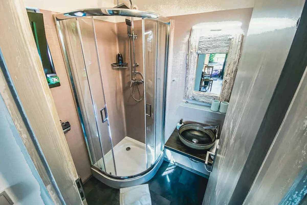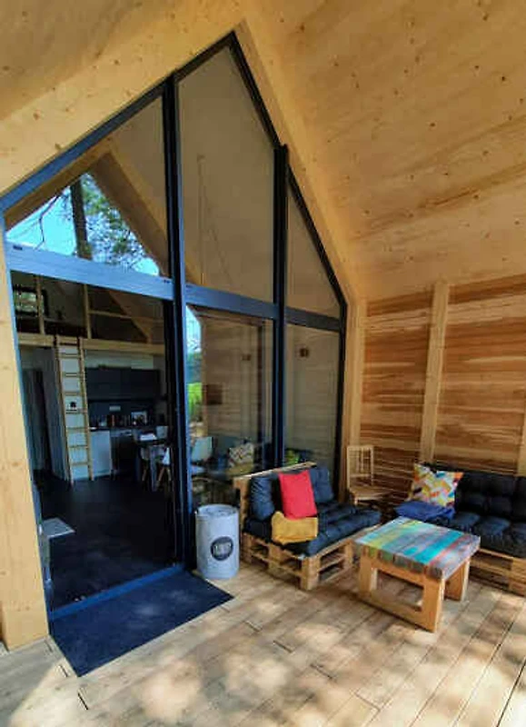 L'ingresso della vostra cabina si trova im Erdgeschoss e conduce sopra una scala esterna direttamente nel soggiorno/camera da letto.