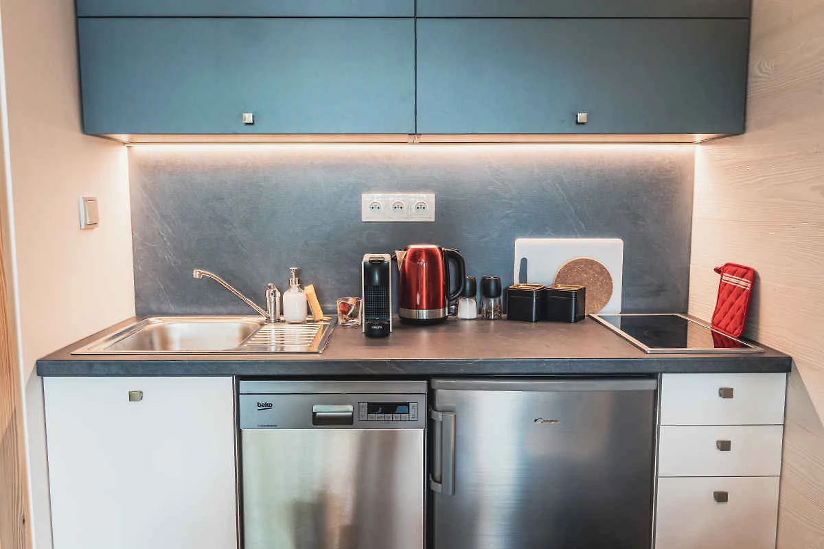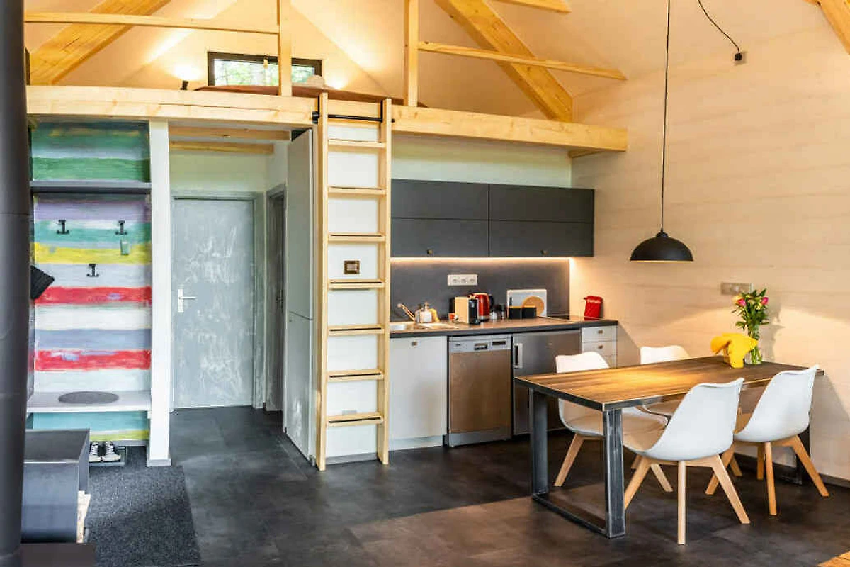 Piano terra: Soggiorno/camera da letto con 1 letto aggiuntivo su divano/sofa, camino e le scale per l'attico sono più ripide/scala allungabile. Camera da letto con 1 letto singolo e 1 letto aggiuntivo su letto a castello (sopra). Angolo cucina in soggiorno/camera da letto con zona pranzo (4 posti), fornello elettrico (2 fornelli), lavastoviglie, frigorifero (40 l, scomparto del ghiaccio), caffettiera e bollitore elettrico. Bagno con doccia, 1 lavandino e WC.