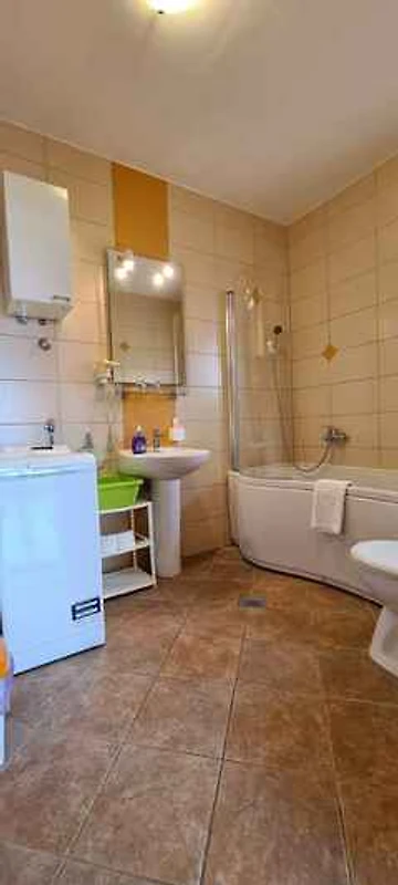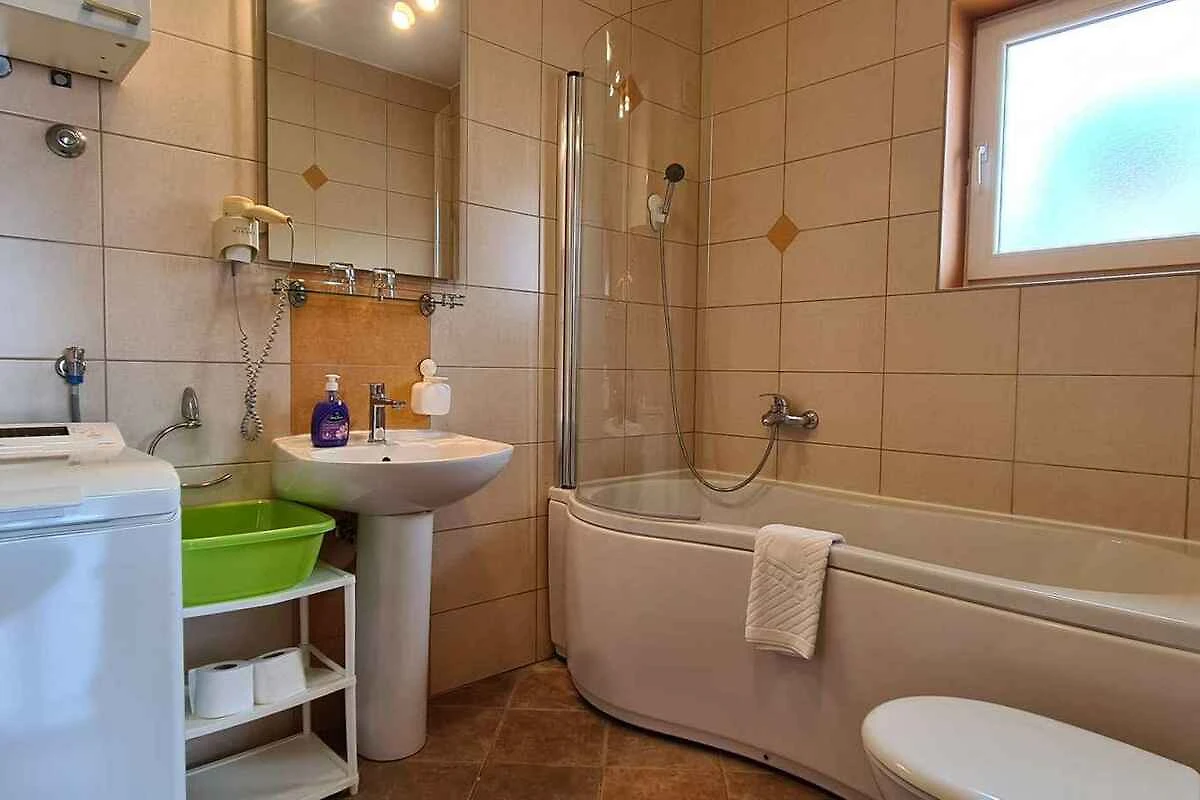 Soggiorno con 2 letti aggiuntivi su alloggi per dormire e TV. Camera da letto (13 mq) con 1 letto matrimoniale e accesso alla terrazza (10 mq). Cucina con stufa a gas, forno, frigorifero, caffettiera e bollitore elettrico. Bagno con vasca da bagno, 1 lavandino, WC e asciugacapelli. WC separato con 1 lavandino e WC.
