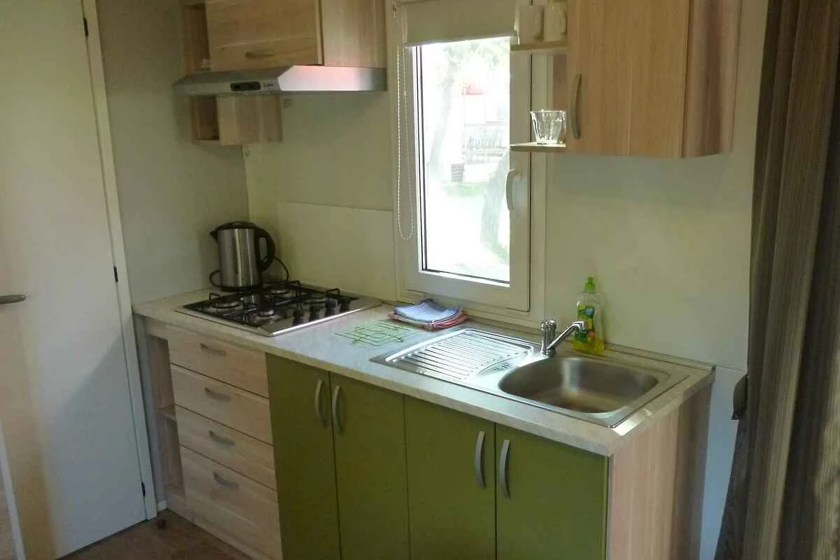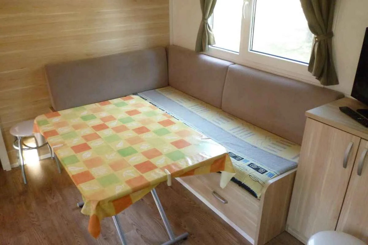 L'ingresso della vostra casa mobile si trova al piano terra e conduce attraverso la terrazza direttamente nella cucina-soggiorno. Camera da letto (6 mq) con 1 letto matrimoniale. Camera da letto (6 mq) con 2 letti singoli. Angolo cottura nella cucina-soggiorno con TV, zona pranzo, fornello a gas, frigorifero, microonde, bollitore elettrico e accesso alla terrazza (mobili da giardino). Bagno (3 mq) con doccia, 1 lavabo e WC.
