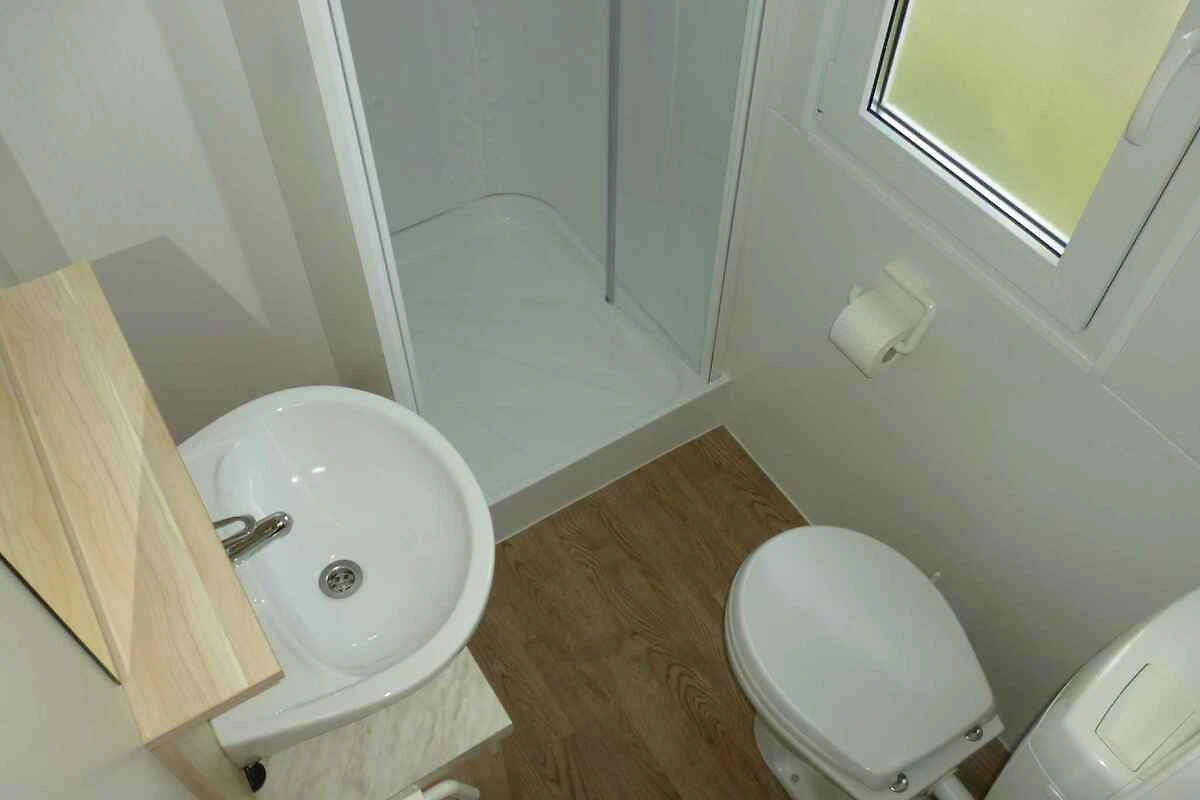 L'ingresso della vostra casa mobile si trova al piano terra e conduce attraverso la terrazza direttamente nella cucina-soggiorno. Camera da letto (6 mq) con 1 letto matrimoniale. Camera da letto (6 mq) con 2 letti singoli. Angolo cottura nella cucina-soggiorno con TV, zona pranzo, fornello a gas, frigorifero, microonde, bollitore elettrico e accesso alla terrazza (mobili da giardino). Bagno (3 mq) con doccia, 1 lavabo e WC.
