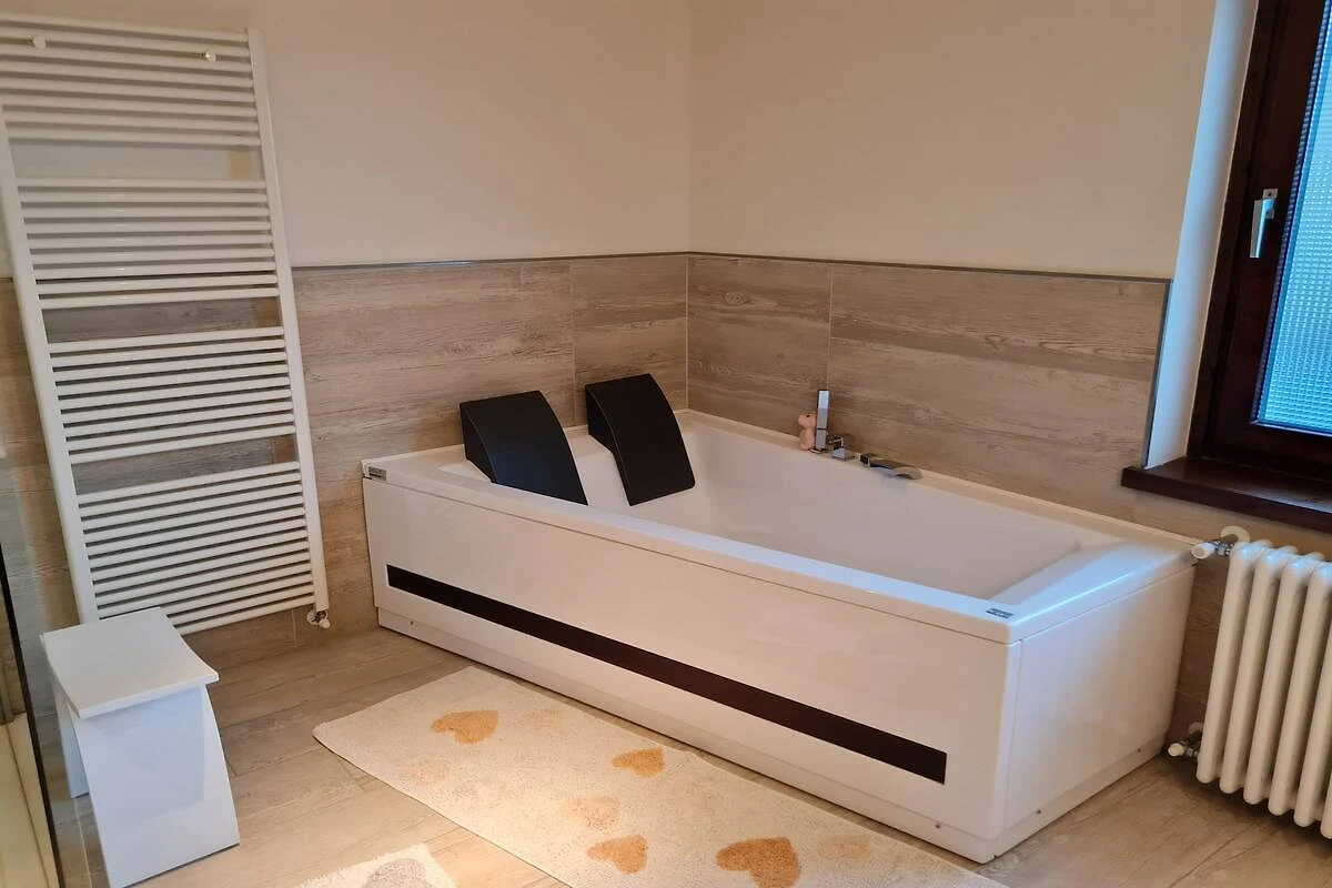 La casa è progettata per il comfort e la praticità, con una cucina completamente attrezzata con elettrodomestici moderni, tra cui frigorifero, microonde, forno, lavastoviglie e macchina per il caffè. Godetevi la spaziosa terrazza di 30 m², perfetta per mangiare all'aperto, o rilassatevi accanto all'accogliente camino. Ulteriori comfort includono Wi-Fi, riscaldamento centralizzato, balcone, parcheggio all'aperto e asciugacapelli, per garantire che il vostro soggiorno sia tanto confortevole quanto memorabile.