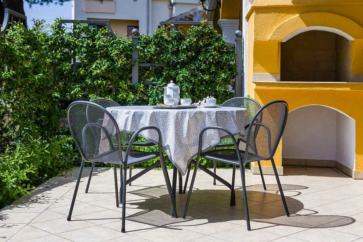 L'ingresso del vostro appartamento si trova im Erdgeschoss. Soggiorno con 1 letto aggiuntivo su divano/sofa e accesso alla terrazza (12 mq). Camera da letto (10 mq) con 1 letto matrimoniale. Angolo cucina nel soggiorno con forno, frigorifero, caffettiera e Piano cottura, stoviglie e posate. Bagno con vasca da bagno, WC e asciugacapelli.