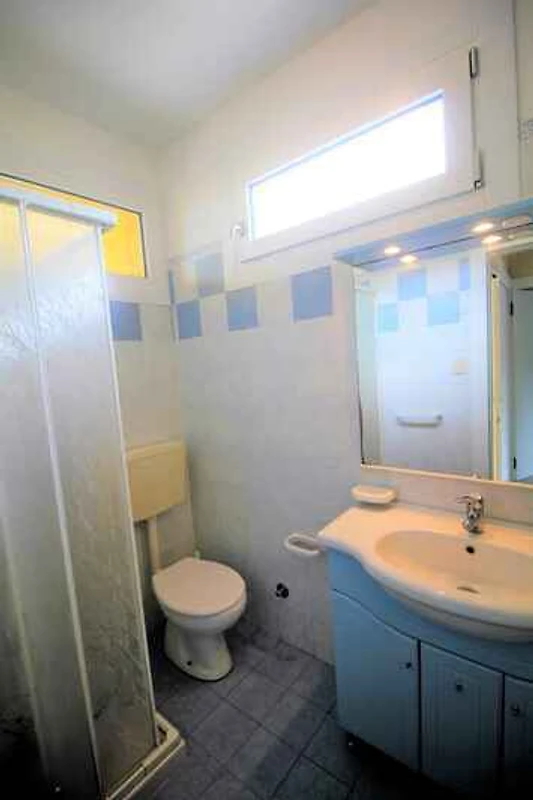 e conduce sopra la terrazza direttamente nella cucina abitabile. Soggiorno/camera da letto con 1 letto aggiuntivo su divano/sofa, angolo di seduta, TV, zona pranzo (6 posti) e accesso alla terrazza (mobili da giardino, 1 tavolo, 3 sedie). Camera da letto con 1 letto a castello. Camera da letto con 1 letto matrimoniale e 1 culla. Cucina con TV, zona pranzo (6 posti), stufa a gas (4 fiamme), frigorifero (scomparto del ghiaccio), microonde, lavatrice e accesso alla terrazza. Bagno con doccia, 1 lavandino, WC e finestra.