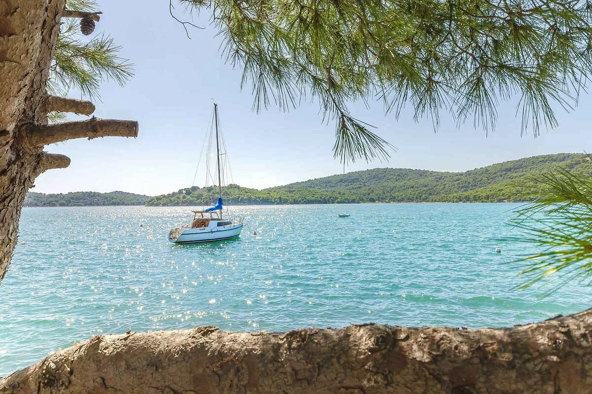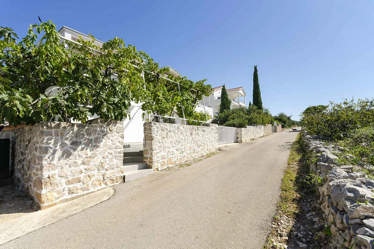 Tisno. Il monolocale si trova su un terreno recintato con prato e alberi, delimitato da una recinzione. L’accesso avviene tramite una strada secondaria (asfaltata). Parcheggio sulla proprietà.