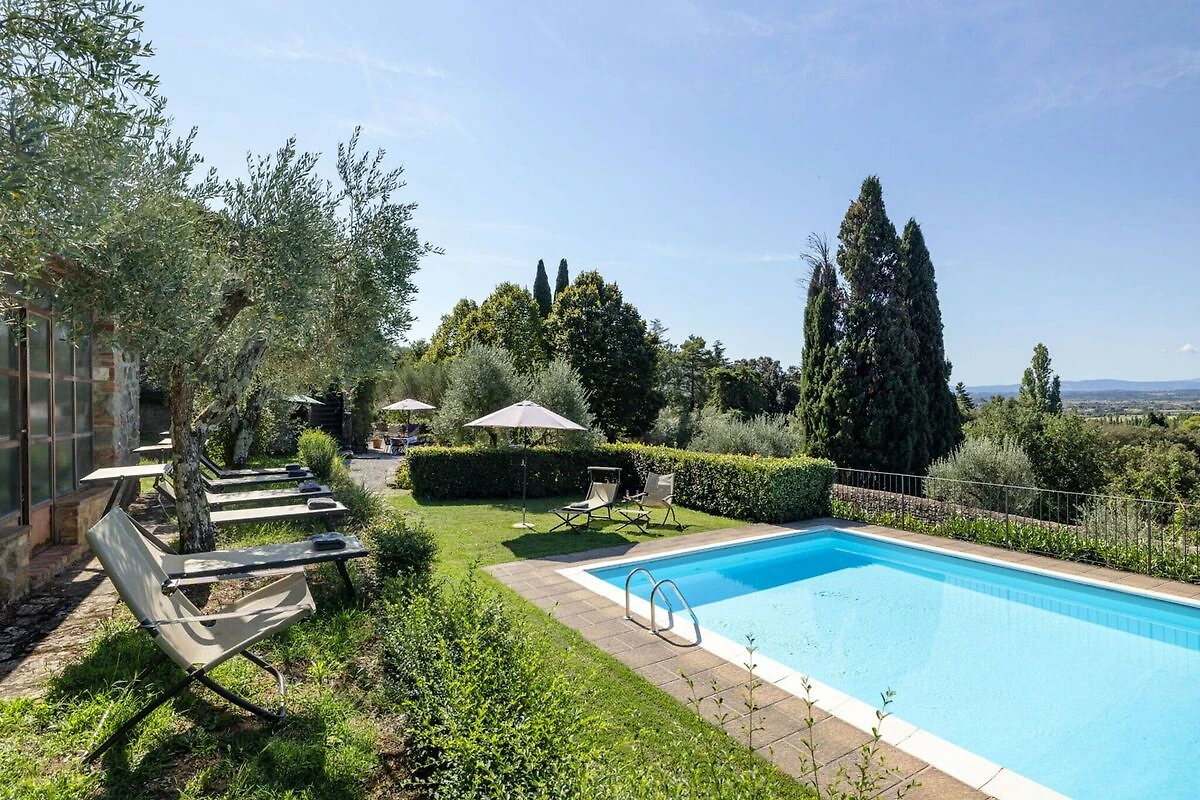 Immersa nel cuore verde della Toscana, a soli 3 km da Cortona, questa villa splendidamente restaurata offre un rifugio tranquillo con una vista mozzafiato sulle colline circostanti. Circondata da un giardino recintato di 3.500 m², coniuga il fascino tradizionale con i comfort moderni, perfetta per famiglie o gruppi di amici. La sua posizione elevata garantisce un'atmosfera serena, permeata dai colori e dai profumi della campagna.