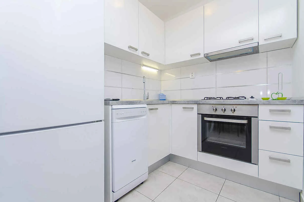 Soggiorno con 1 letto aggiuntivo su divano/sofa. Camera da letto (10 mq) con 2 letti singoli. Camera da letto (14 mq) con 1 letto matrimoniale e 1 letto aggiuntivo. Angolo cucina nel soggiorno con stufa a gas, forno, lavastoviglie e frigorifero. Bagno con doccia e WC.