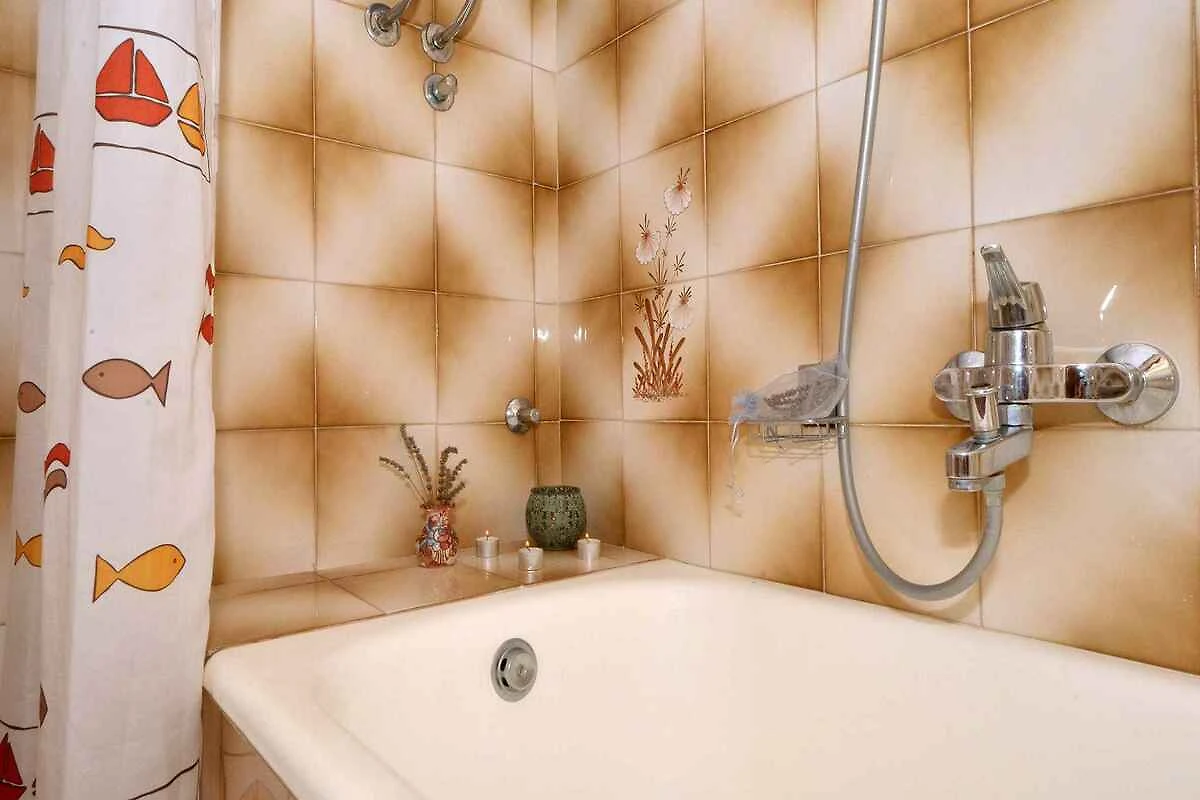 e conduce direttamente nella cucina abitabile. Soggiorno (camera di passaggio) con angolo di seduta, TV e accesso al balcone. Camera da letto (15 mq) con 1 letto matrimoniale. Camera da letto (15 mq) con 1 letto matrimoniale e 1 letto singolo. Camera da letto (15 mq) con 3 letti singoli. Angolo cucina nel soggiorno con zona pranzo (8 posti), stufa a gas (4 fiamme), forno, cappa aspirante, frigorifero e bollitore elettrico. Bagno con doccia, 1 lavandino, WC e bidet. Bagno con vasca da bagno, 1 lavandino, WC, bidet e finestra.