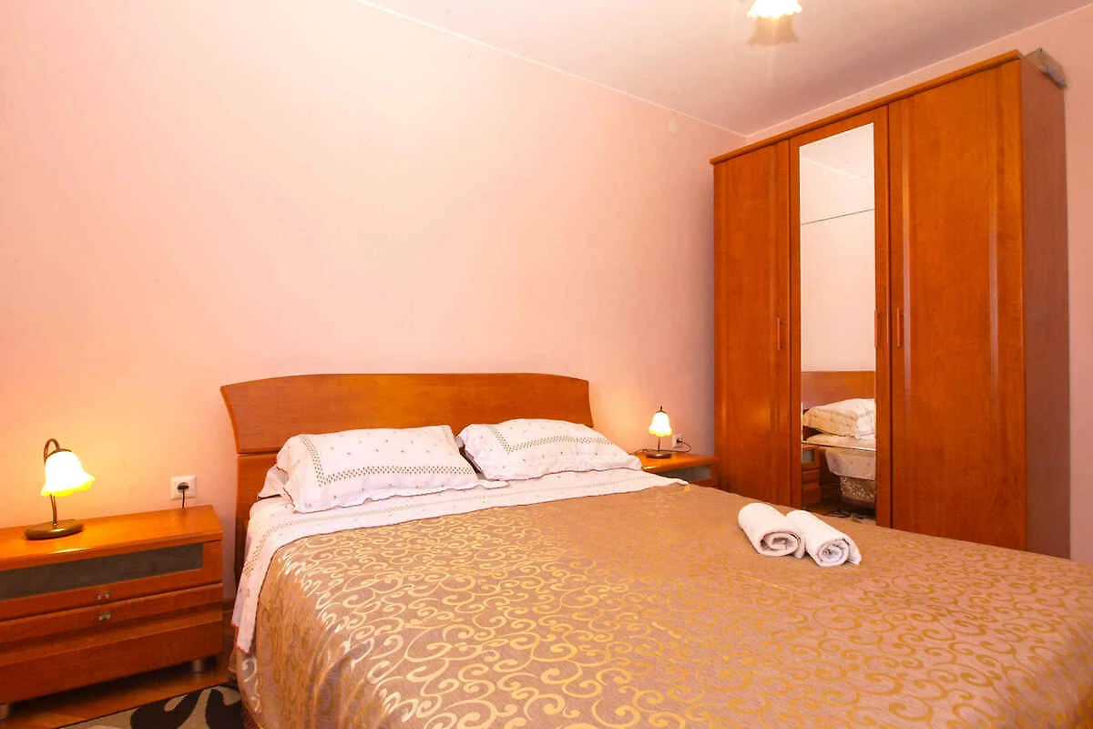 L'ingresso del vostro appartamento conduce direttamente nel vestibolo. Soggiorno (6 mq) con 1 letto aggiuntivo su divano/sofa, angolo di seduta, TV e accesso alla terrazza (12 mq, mobili da giardino, 1 tavolo, 4 sedie, ombrellone). Camera da letto (12 mq) con 1 letto matrimoniale. Cucina americana (6 mq) con zona pranzo (2 posti), stufa a gas (2 fiamme), fornello elettrico (piano cottura ceran, 2 fornelli), forno, cappa aspirante, frigorifero (scomparto del ghiaccio) e caffettiera. Bagno (6 mq) con doccia, 1 lavandino, WC, bidet, asciugacapelli e finestra.