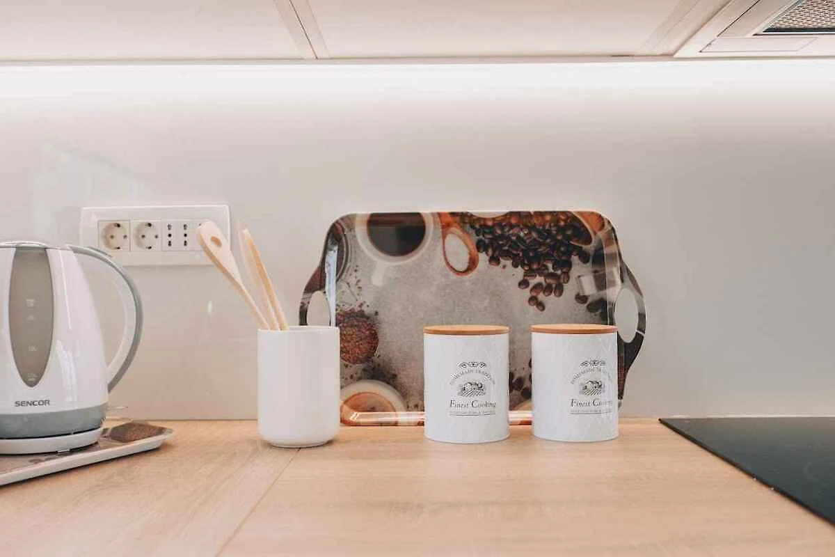 . Soggiorno con 2 letti aggiuntivi su divano/sofa, TV e accesso al balcone (13 mq). 3 camere da letto tutto a con 1 letto matrimoniale. Angolo cucina nel soggiorno con fornello elettrico (4 fornelli), forno, lavastoviglie, frigorifero, caffettiera, tostapane e bollitore elettrico. Bagno con doccia e asciugacapelli. Bagno con lavatrice, doccia e asciugacapelli.