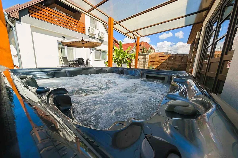 Siofok. L' appartamento vacanze si trova in una trama del giardino chiuso, grande 180 mq con prato, fiori e arbusti, delimitata da una recinzione. Il proprietario non abita nella casa o nella proprietá. L'accesso avviene vicino a una strada secondaria (asfaltata). Parcheggio (per 2 auto) sulla proprietà e strada davanti alla casa.