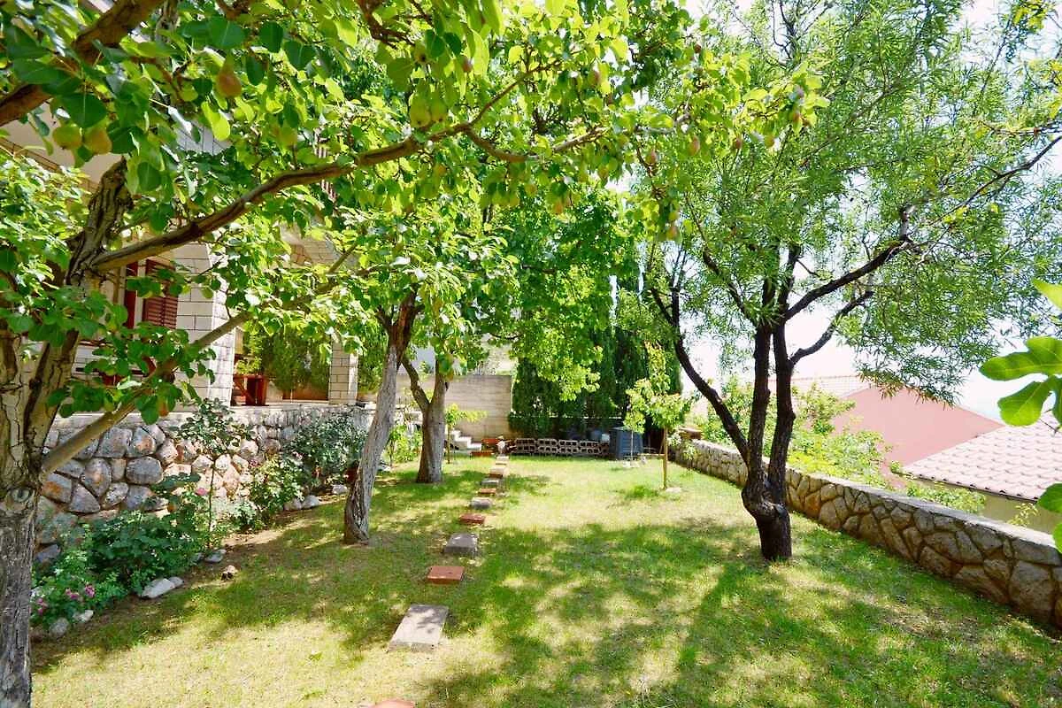 Senj. L' appartamento vacanze si trova in una trama del giardino chiuso con prato, fiori, arbusti e alberi, delimitata da un muro. Il padrone di casa vive nella casa. Parcheggio sulla strada davanti alla casa.