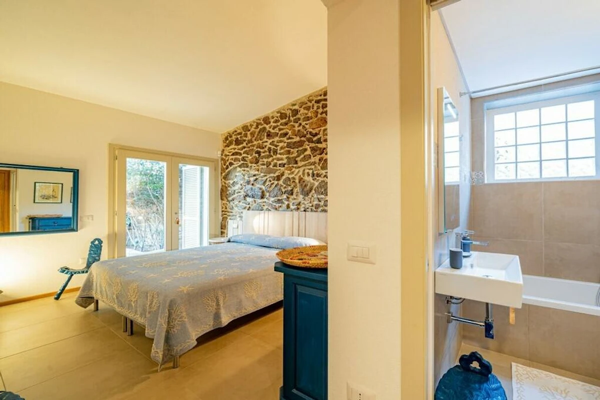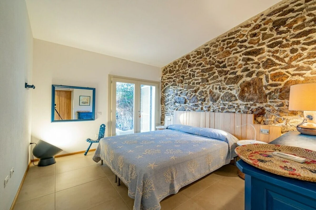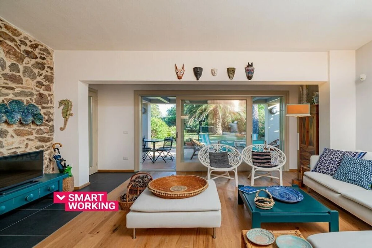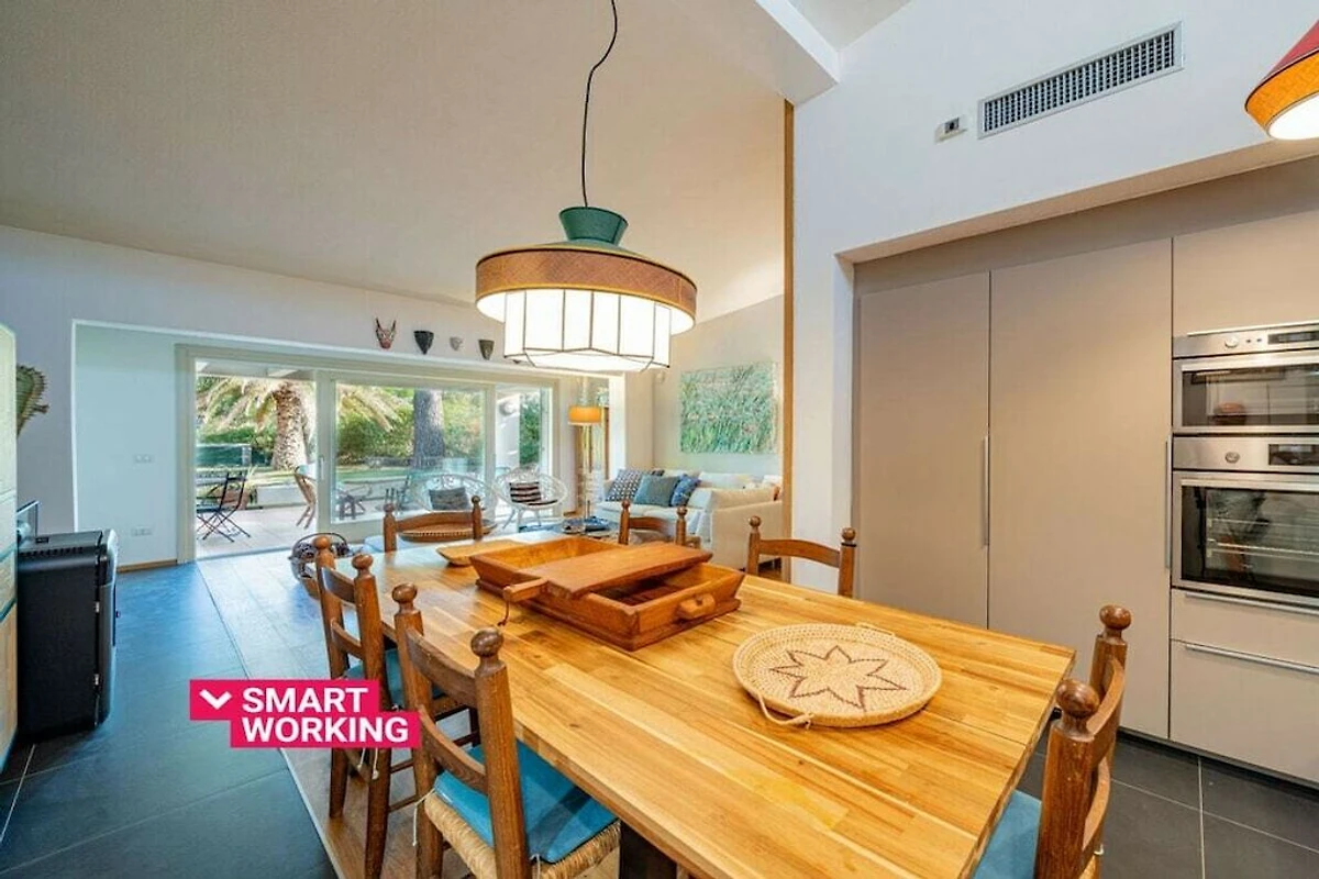 Questa villa accoglie i suoi ospiti con un giardino alberato e un ampio terrazzo che offre una zona relax con poltrone, sdraio e tavolino, oltre ad una zona pranzo con tavolo e sedie. Qui, attraverso un'ampia porta finestra, si accede alla zona giorno open space con una bella parete in pietra, decorata con elementi di design e arredata con un divano ad L, un tavolino, un pouf, un televisore, un tavolo da pranzo e una cucina completamente attrezzata. cucina con forno, lavastoviglie e microonde.