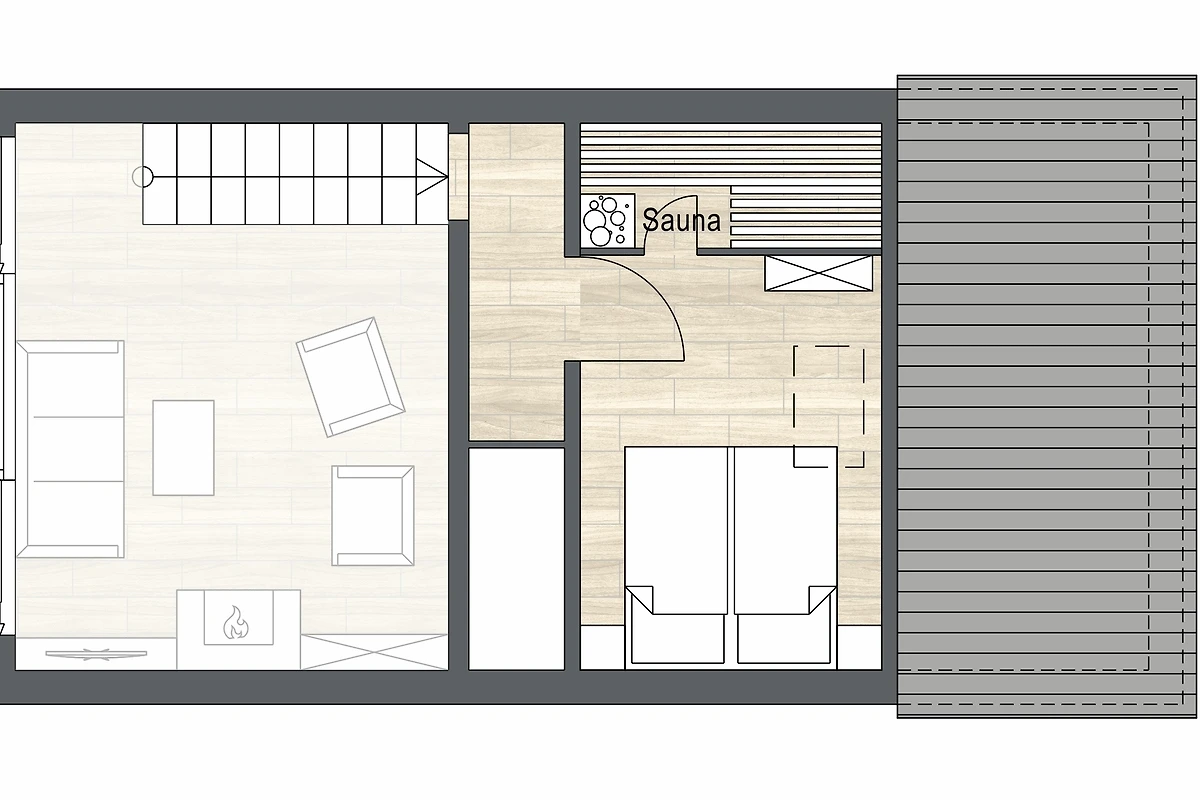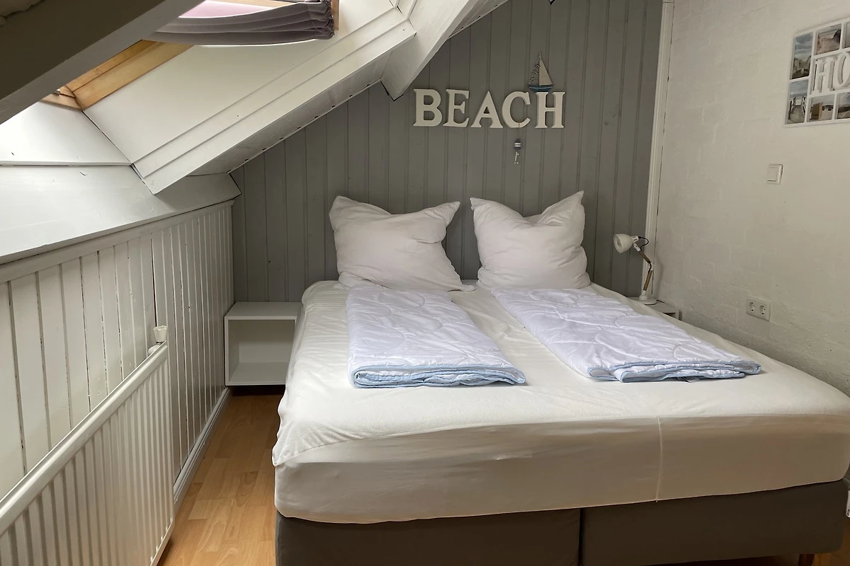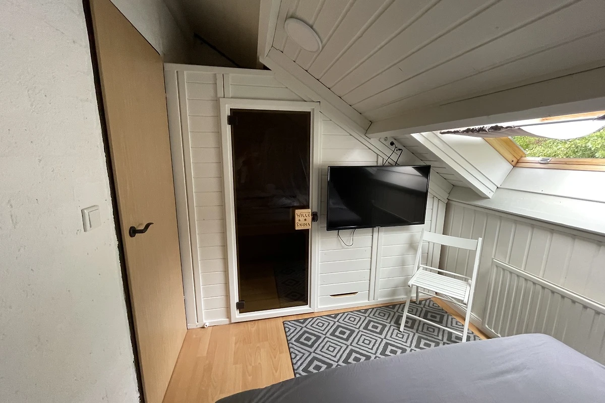 Al piano superiore si trova un'ulteriore camera da letto con un accogliente letto boxspring (160cm x 200cm) e una piccola sauna, dove è possibile concedersi una pausa e sfuggire allo stress quotidiano.