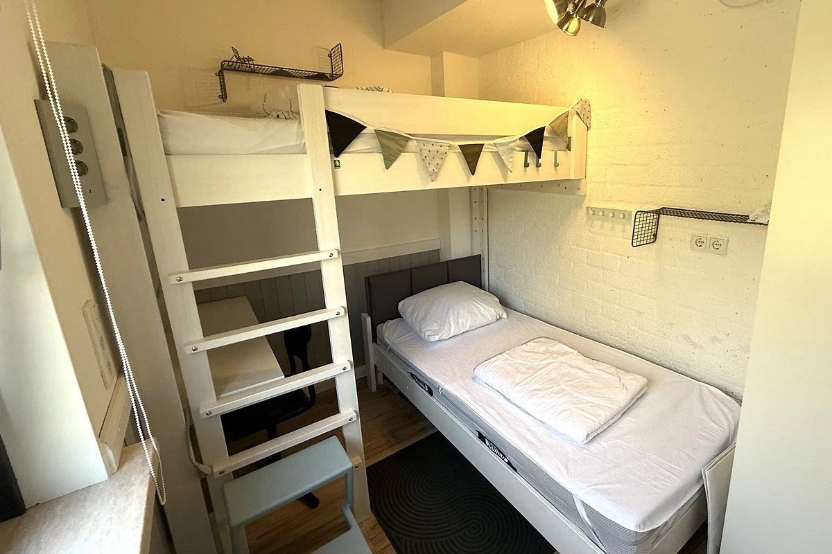 La nostra casa, arredata con grande amore, ha una superficie di circa 55 m2 distribuiti su due livelli. Al piano terra si trova una camera da letto (cameretta) con un letto a castello stabile, che può essere utilizzato anche da adulti (larghezza materasso 90 cm),