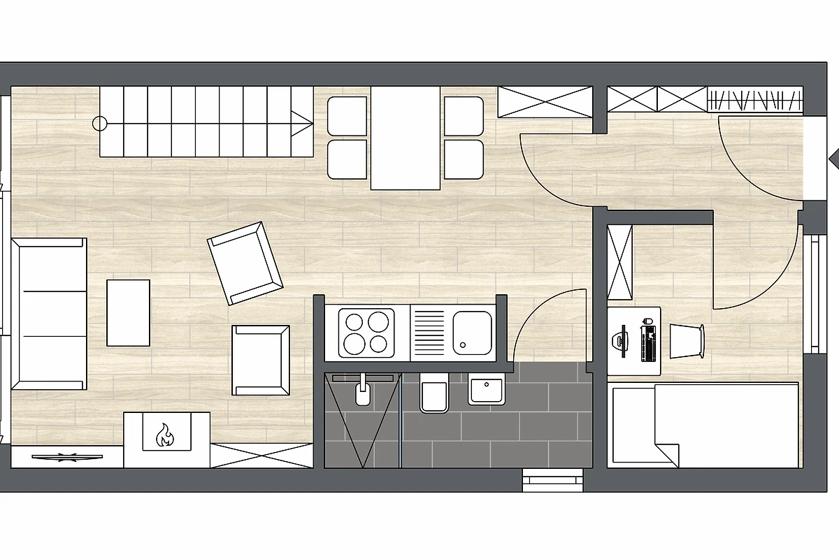 il soggiorno aperto, sala da pranzo con TV, una stufa a legna accogliente, un moderno bagno con doccia illuminato dalla luce naturale, nonché una cucina moderna.