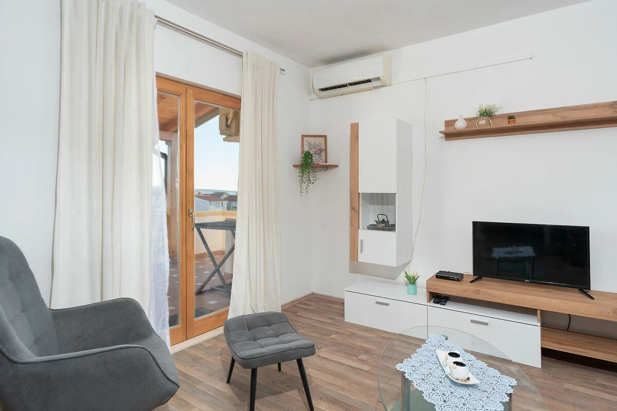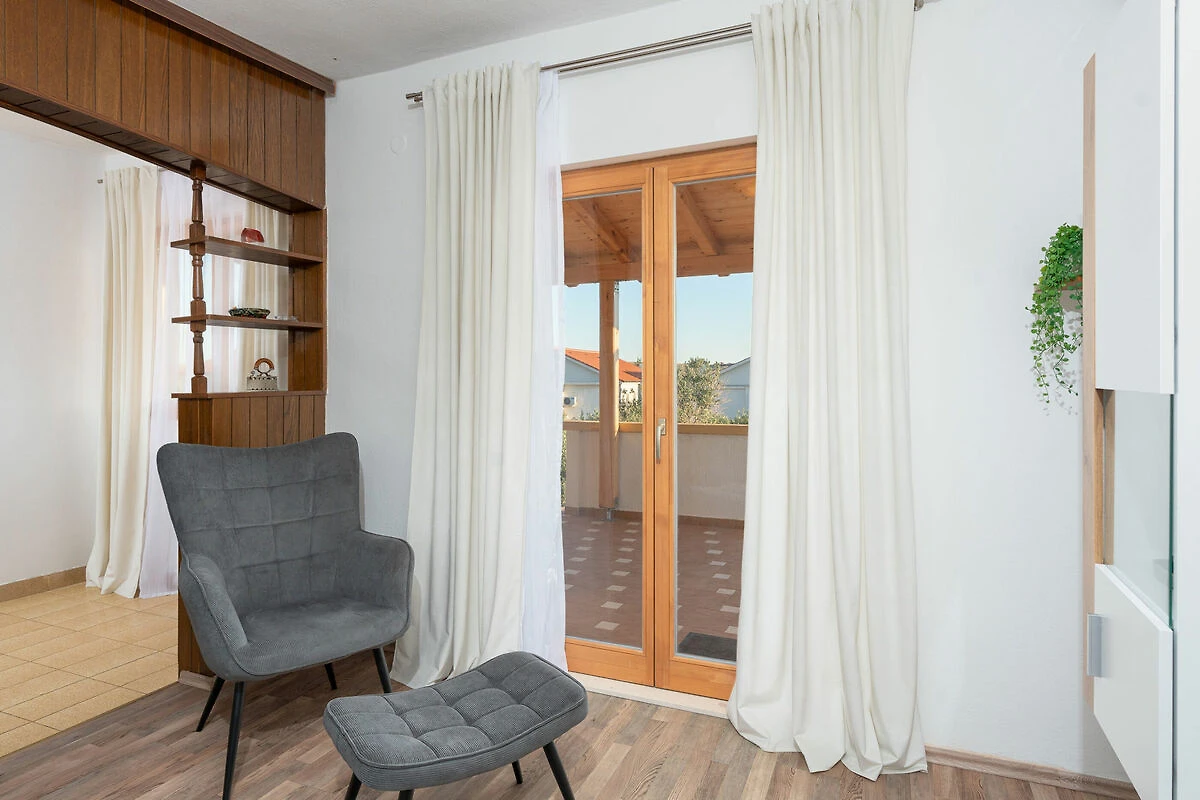 L' appartamento vacanze si trova in un appartamento casa ed è arredato rustico. La proprietà si trova in periferia. Anche a causa della vista dalla struttura sul mare, il domicilio è popolare. Attrezzature in comune: possibilità di grigliare, terrazza, mobili da giardino e fattoria. è consentito fumare