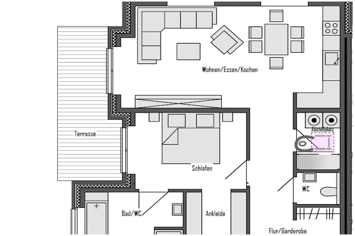 Il cuore dell'appartamento è la spaziosa zona soggiorno-pranzo open space, che non lascia nulla a desiderare con una moderna cucina completamente attrezzata con fornello elettrico, microonde, forno e lavastoviglie. Inizia la giornata con un caffè appena macinato dalla macchina per il caffè completamente automatica.