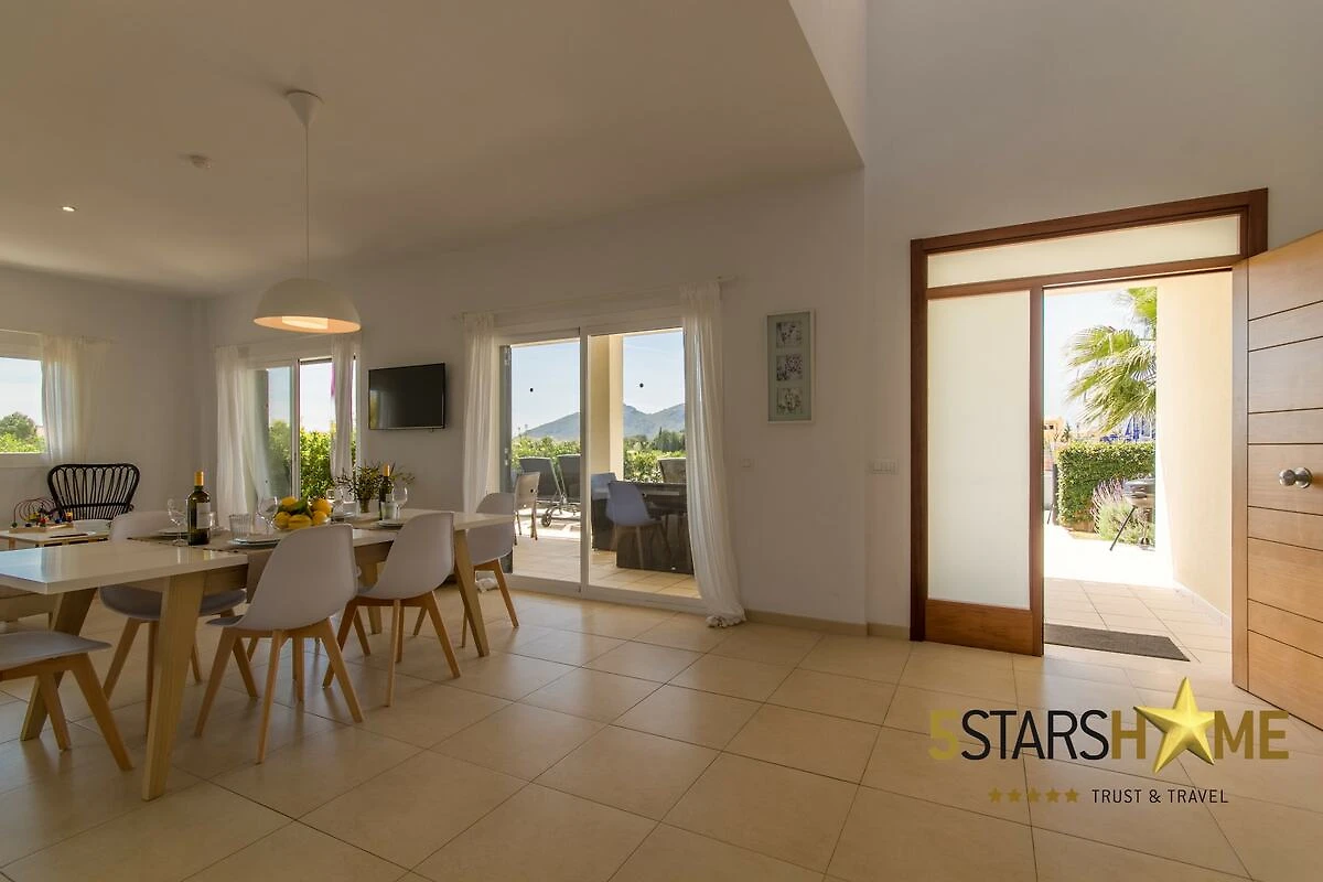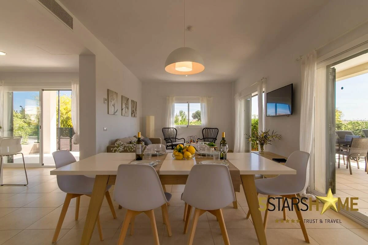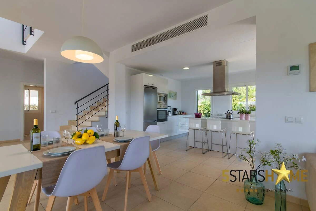 Gli interni di 212 m² della villa si sviluppano su due piani e presentano un luminoso soggiorno open space con comode sedute e un'ampia zona pranzo. L'elegante cucina è completamente attrezzata e include un bancone per la colazione, perfetto per pasti informali. Le ampie porte scorrevoli in vetro si aprono direttamente sul giardino e sulla piscina, creando un'esperienza di connessione tra interno ed esterno senza soluzione di continuità. Su richiesta, sono disponibili articoli essenziali per neonati, come culle e seggioloni, rendendo questa casa ideale per famiglie di tutte le età.