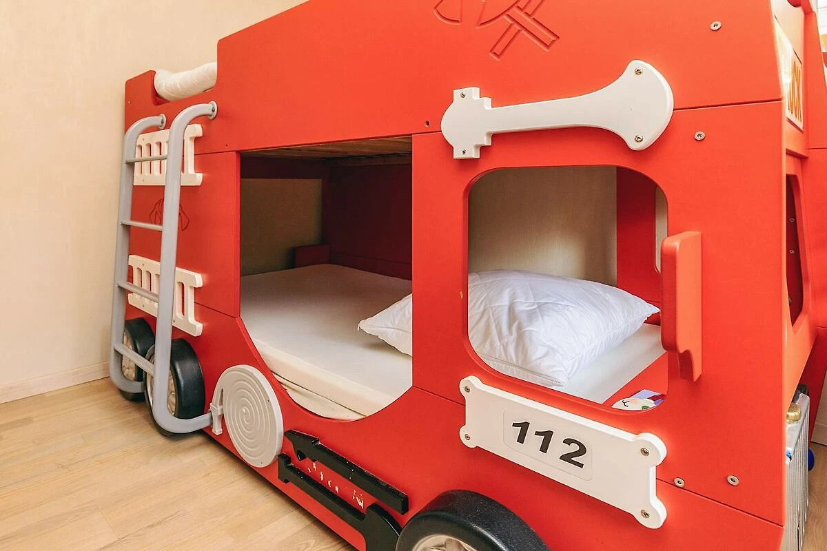 La casa estiva dispone di una camera da letto con letto a castello tipo camion dei pompieri e TV con Chromecast e lettore DVD, e di un letto matrimoniale nell'ampio soppalco. Un letto matrimoniale è disponibile anche nella dependance. Il bagno della casa estiva è dotato di WC, lavandino e doccia. Il cottage si trova su un terreno naturale di 800 m² con due terrazze con mobili da giardino per adulti e bambini, oltre a lettini prendisole. Il giardino dispone anche di un trampolino e di uno scivolo per i più piccoli, e quando è il momento di rilassarsi, è possibile accendere un fuoco nel braciere o prolungare il piacere della serata seduti sotto la terrazza coperta, perfetta per cucinare sulla griglia a carbone.