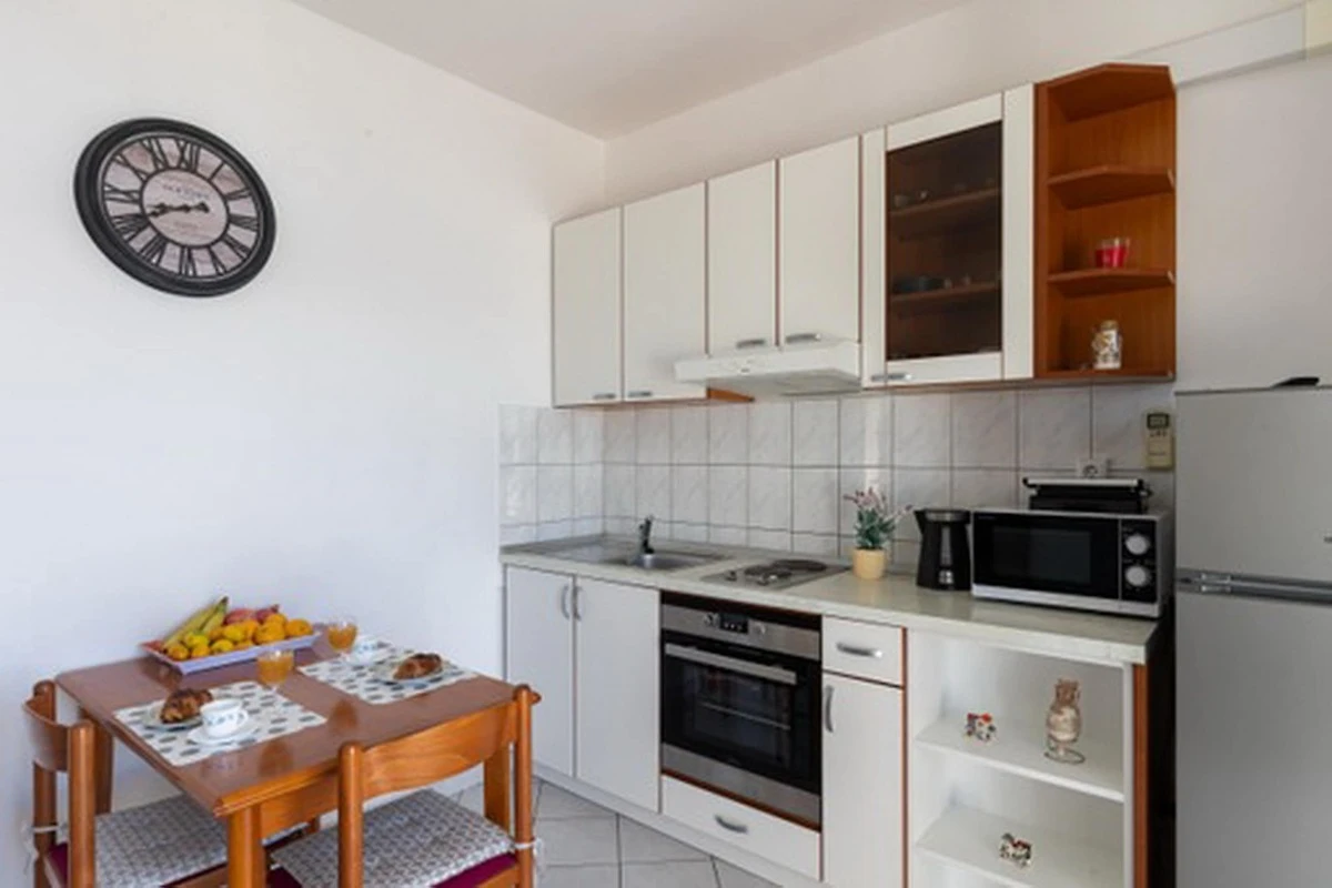 This One Bedroom Apartment with Terrace and Sea view features WiFi, air-conditioning and SAT TV. Kitchen is equipped with a stove, microwave, refrigerator and water kettle. Bathroom includes shower cabin. Terrace with an outdoor furniture offers breathtaking views of the Adriatic sea.