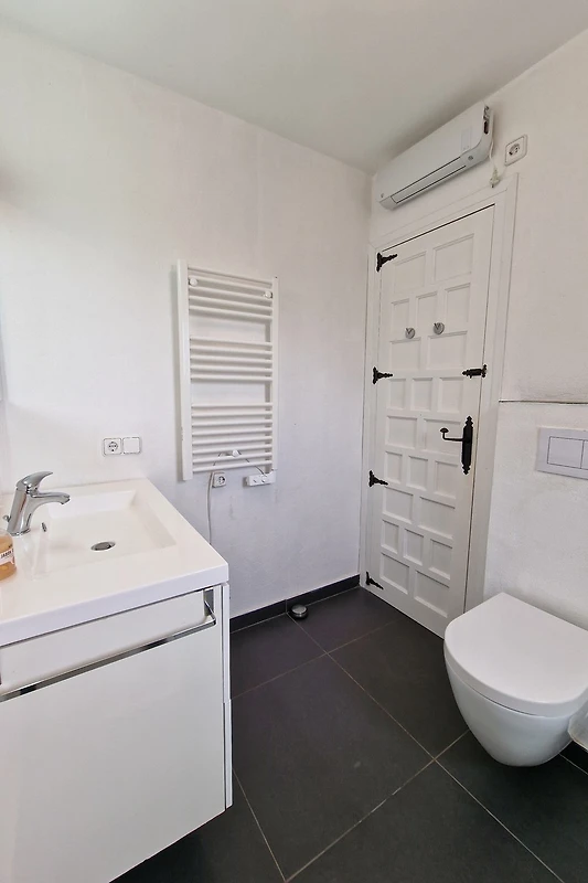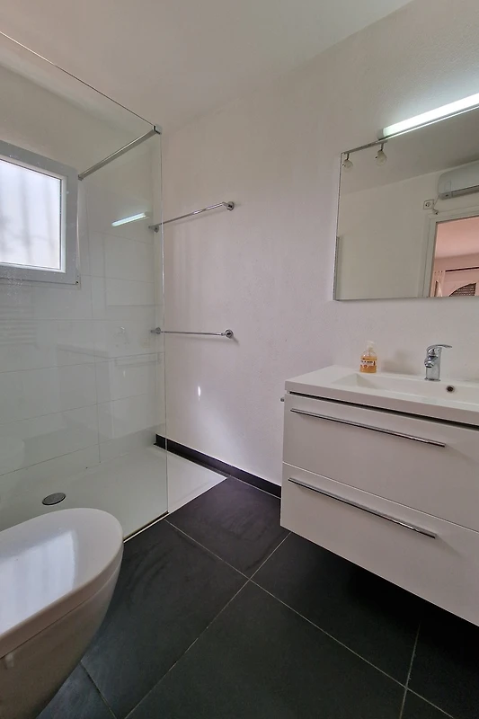 2 bagni (uno dei quali en suite) con doccia walk-in, WC, lavabo, finestra, 1 asciugacapelli, termoventilatore in ceramica e scaldasalviette
