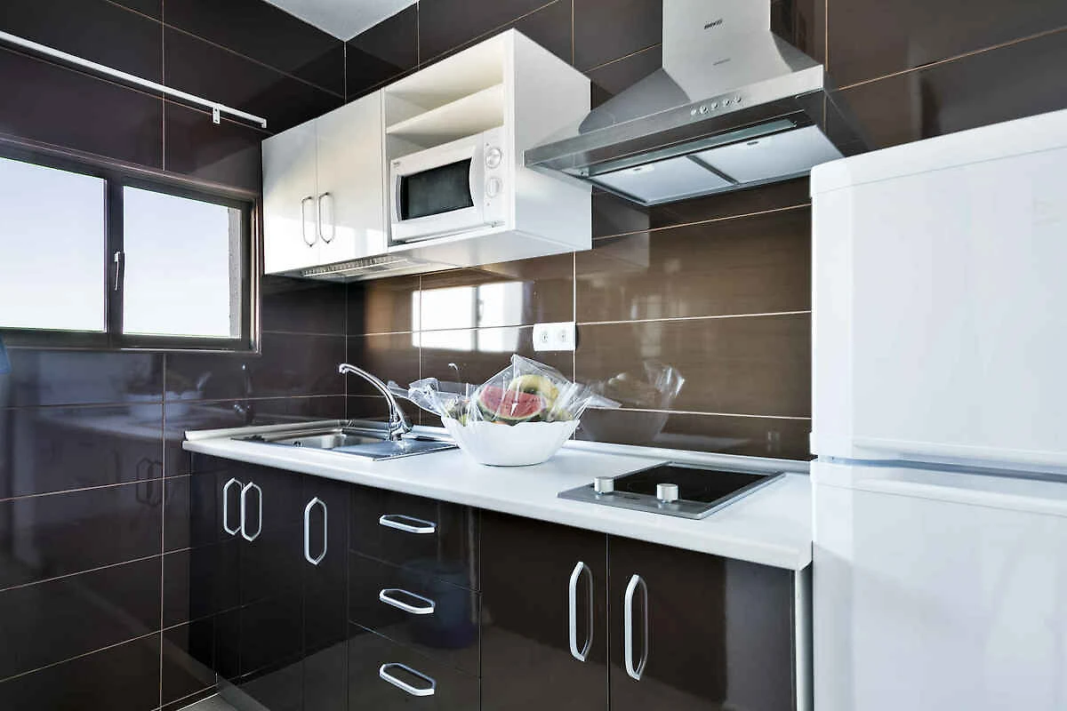 Soggiorno/camera da letto con 1 letto aggiuntivo su divano letto doppio e accesso al balcone. Camera da letto con 2 letti singoli e Letti da 90 cm. Camera da letto con 2 letti singoli e Letti da 90 cm. Angolo cucina in soggiorno/camera da letto con stufa a gas (2 fiamme), cappa aspirante, frigorifero, microonde, accesso al balcone e Attrezzatura da cucina: 6 piatti da portata - 6 piatti fondi; 6 piatti da dessert; 6 tazze; 6 bicchieri da acqua; 1 caffettiera italiana; 1 padella; 1 pentola; 1 casseruola; 6 cucchiai; 6 forchette; 6 coltelli da cucina; 6 cucchiaini; 1 puntatore; 1 coltello seghettato; 1 mestolo; 1 cucchiaio forato; 1 apriscatole; 1 cavatappi; 1 panno; 1 tovaglia; tovaglioli di carta; 1 piatto ovale; 1 piatto rotondo; 1 insalatiera; 1 scopa; 1 paletta; 1 mocio; 1 pattumiera. Bagno con vasca da bagno e WC.