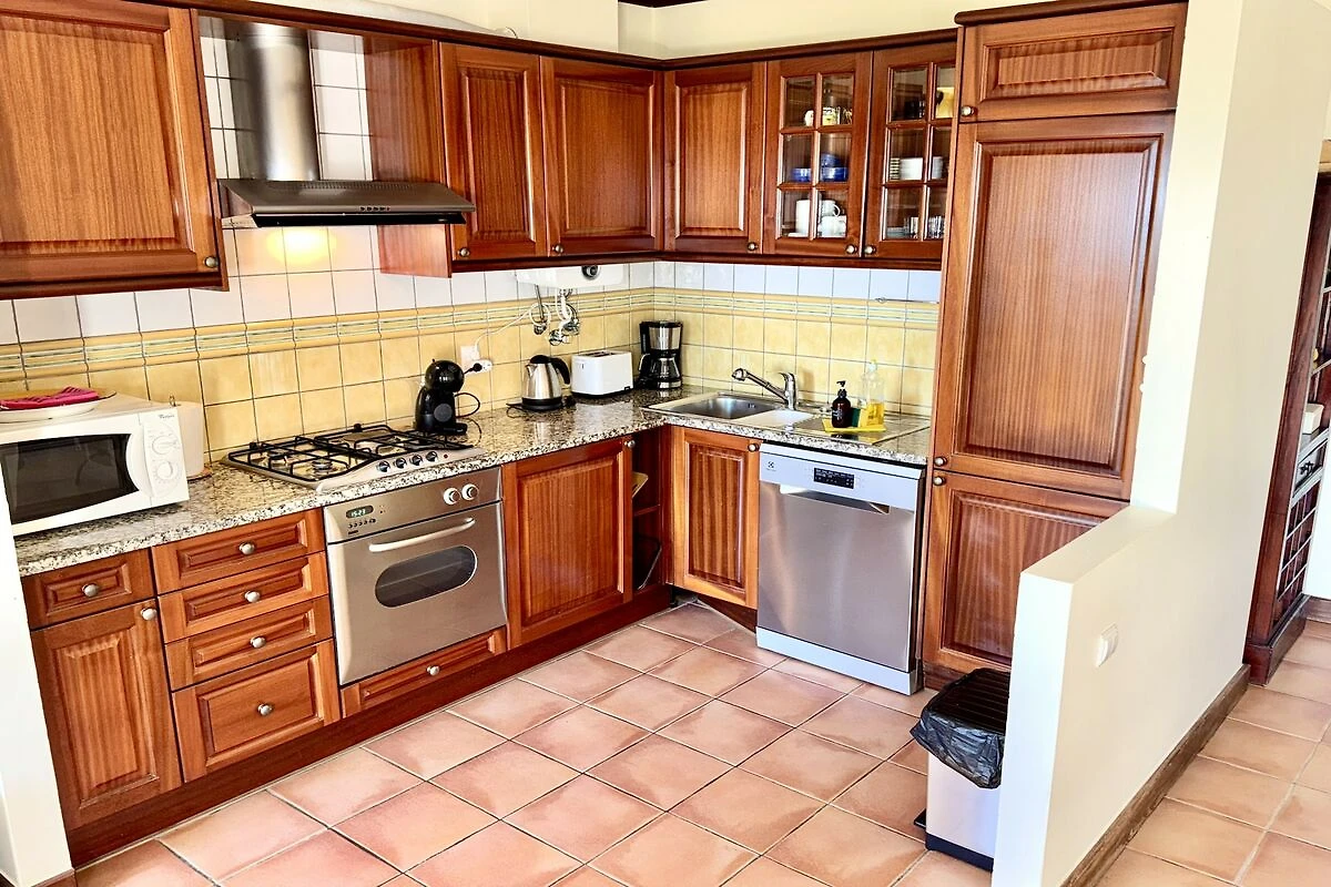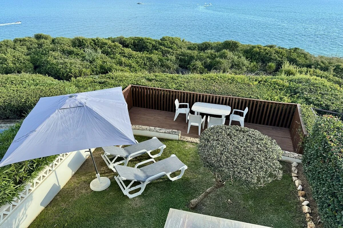 La cucina completamente attrezzata è progettata per il viaggiatore moderno, con elettrodomestici di alta qualità come frigorifero, congelatore, forno e lavastoviglie. Puoi gustare le tue creazioni culinarie nella sala da pranzo adiacente o sulla terrazza arredata mentre ammiri viste mozzafiato sul mare. L'invitante soggiorno vanta comode sedute e una TV a schermo piatto con canali satellitari, perfetta per rilassarsi dopo una giornata di esplorazione. Da qui, puoi accedere alla terrazza privata, dove puoi rilassarti, prendere il sole o fare un tuffo nella piscina in comune.