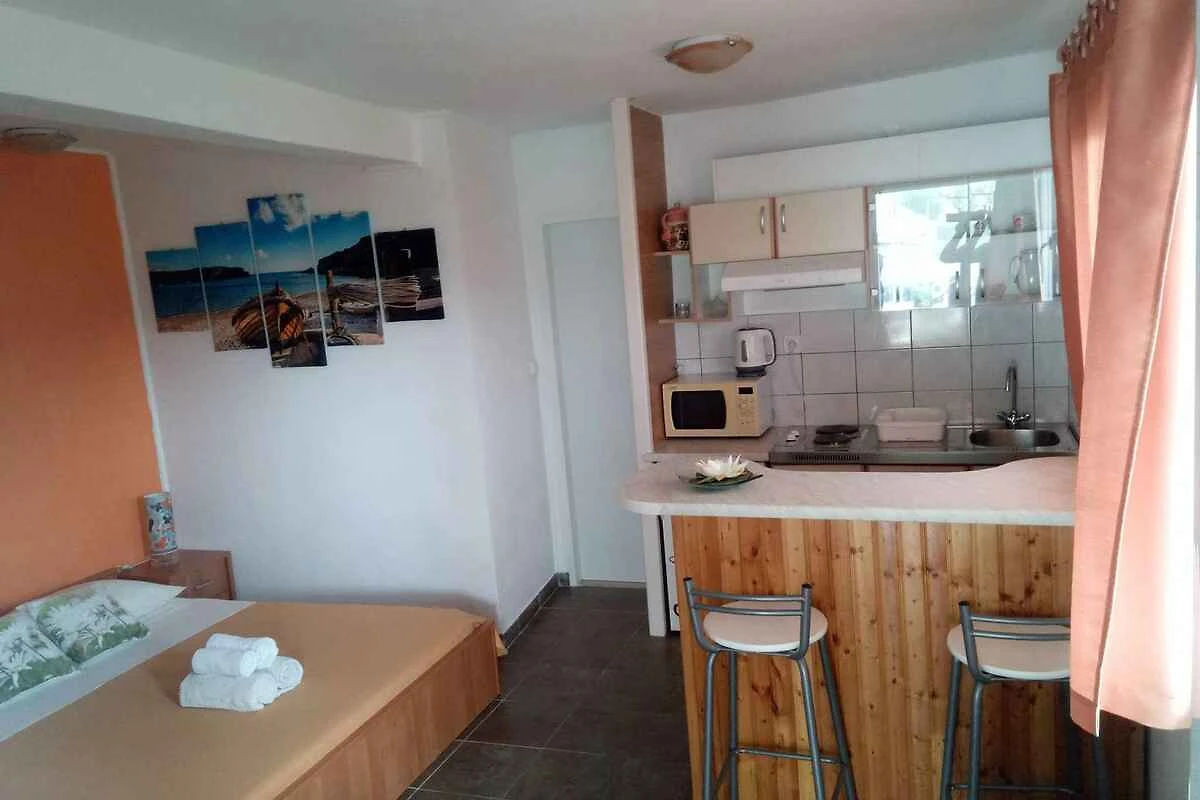 Soggiorno con 1 letto matrimoniale, angolo di seduta, TV, zona pranzo (2 posti) e accesso alla terrazza. Angolo cucina nel soggiorno con fornello elettrico (2 fornelli), frigorifero, microonde e bollitore elettrico. Bagno con doccia, WC e finestra.