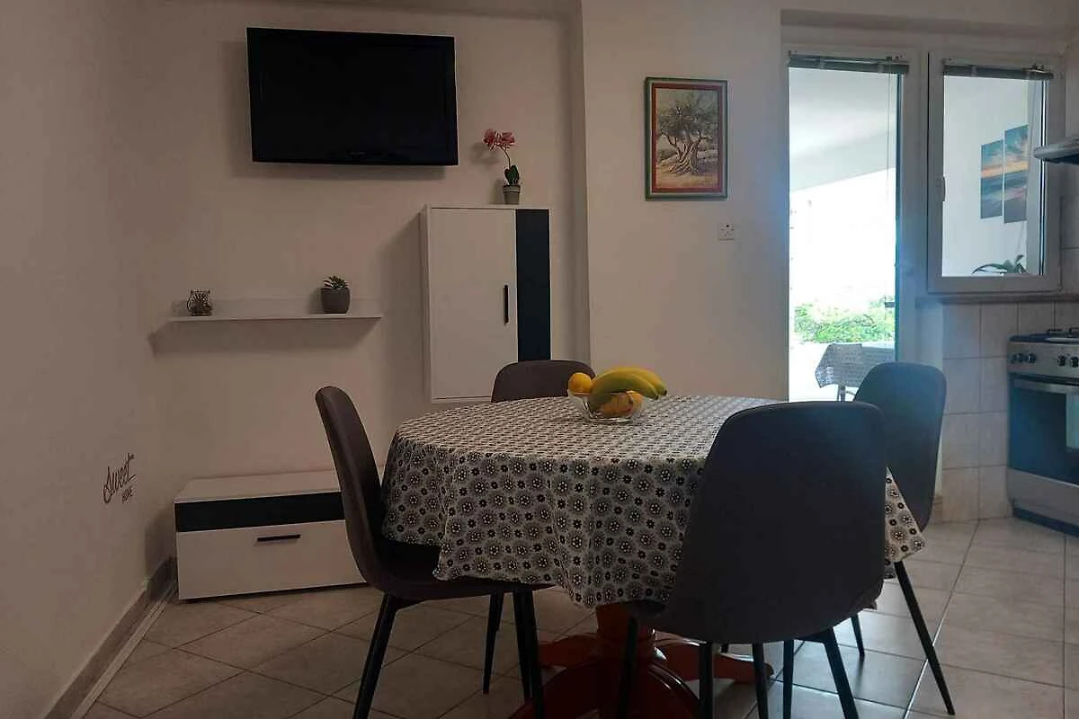 Soggiorno con angolo di seduta, TV, zona pranzo (5 posti) e accesso alla terrazza. Camera da letto con 1 letto matrimoniale e 1 letto singolo. Camera da letto con 1 letto matrimoniale. Angolo cucina nel soggiorno con fornello elettrico (4 fornelli), forno, lavastoviglie, frigorifero e bollitore elettrico. Bagno con doccia e WC.