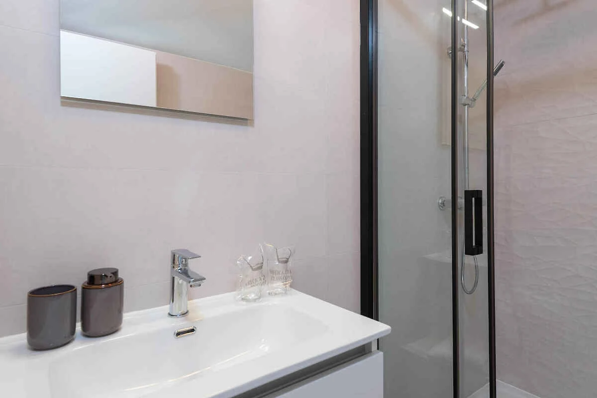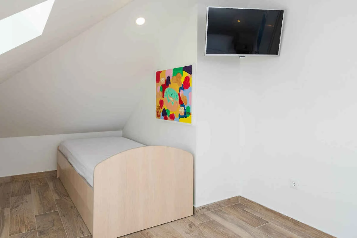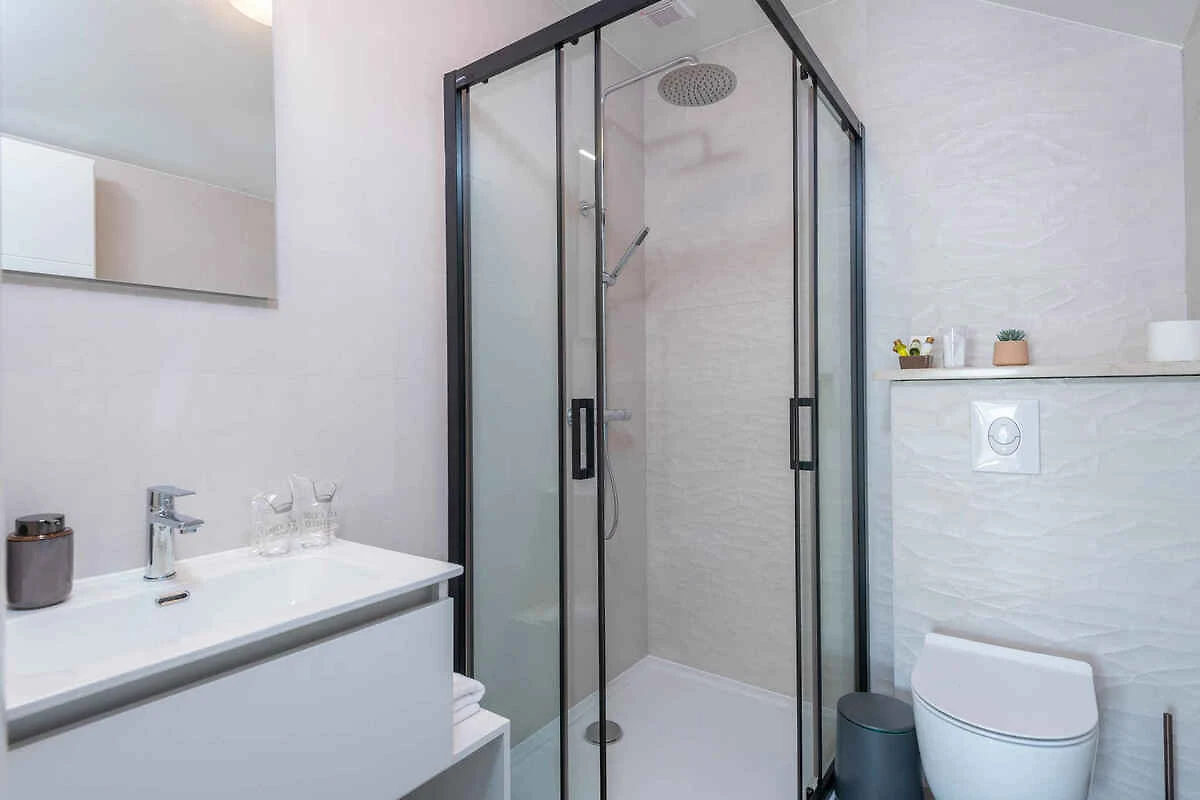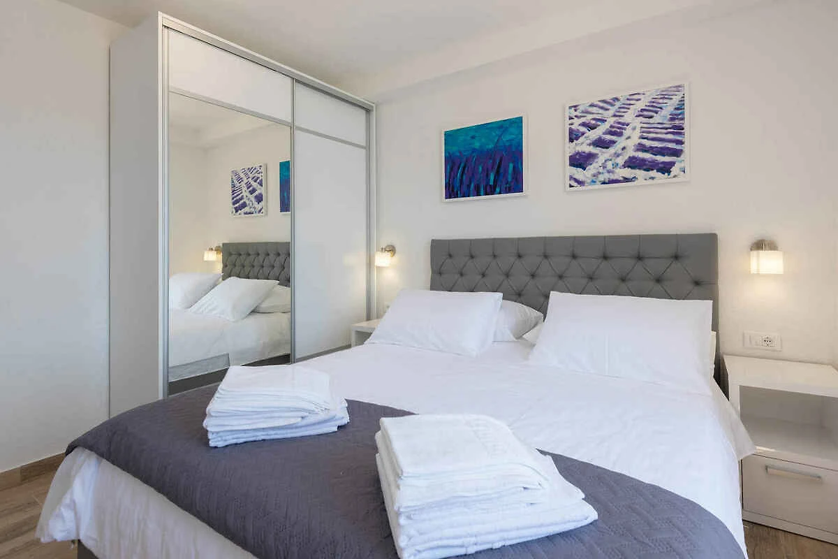 Soggiorno con angolo di seduta, TV, zona pranzo (8 posti) e accesso alla terrazza. Camera da letto (20 mq) con 1 letto matrimoniale. Camera da letto (18 mq) con 1 letto matrimoniale. 2 camere da letto tutto a (16 mq) con 1 letto matrimoniale. La cucinetta nel soggiorno con fornello elettrico (4 fornelli), forno, lavastoviglie, frigorifero (scomparto del ghiaccio), microonde, caffettiera, tostapane e bollitore elettrico. Bagno con doccia, WC e finestra. Bagno con doccia e WC. Bagno con vasca da bagno, doccia e WC.