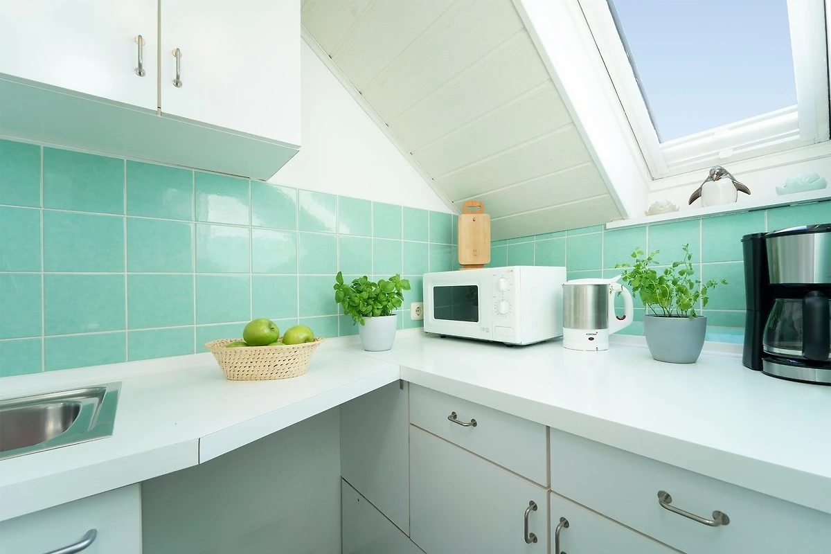 Die Wohnung ist langsam in die Jahre gekommen. Die Küche braucht eine Überholung und ein Dachfenster ließ sich nicht mehr öffnen. Das WLAN bricht nach wenigen Minuten ab, so dass eine durchgehende Nutzung nicht möglich ist. Der Esstisch und das Doppelbett sind neu eingerichtet. Der Rest ist alt.