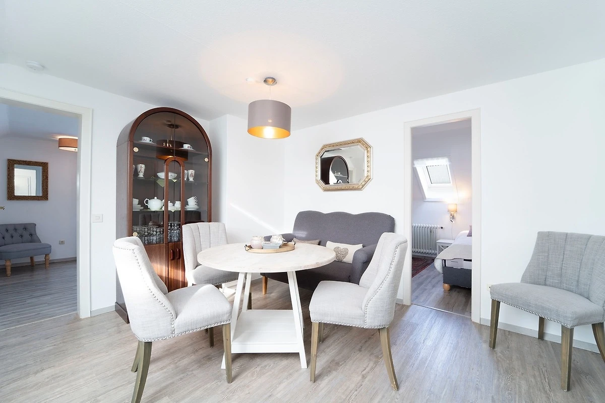 Im Großen und Ganzen war es ein schöner Urlaub in einer schönen, gemütlichen, sehr geräumigen Wohnung. Allerdings ist die Wohnung an einigen Stellen reperaturbedürftig (Fenster im Wohn-/Esszimmer, Licht in der Küche, Armatur an der Küchenspüle). Für den abgerechneten Endreinigungspreis könnte es sauberer sein. Teppiche finde ich in einer Ferienwohnung nicht unbedingt hygienisch, da auch Hunde mitreisen dürfen. Toll war das eigene Schlafzimmer für Kinder und - perfekt! -, dass das Kinderzimmer abgedunkelt werden kann. Damit haben wir nicht gerechnet. Das ist eher selten. Falls einmal Möbel ausgetauscht werden sollten, würde ich Stühle/Couch mit einem abwischbaren Bezug empfehlen. Und eine Unterstellmöglichkeit (Garage?) für Fahrräder wäre hilfreich. Die Parkplatzsituation ist perfekt.