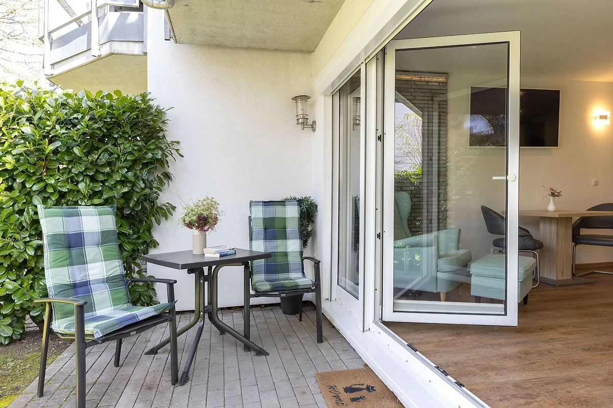 Kleine Terrasse für 2 Personen reicht, Einkaufsmöglichkeiten und Strand nicht weit entfernt. Gute Ausschilderung der Fahrrad Wege.