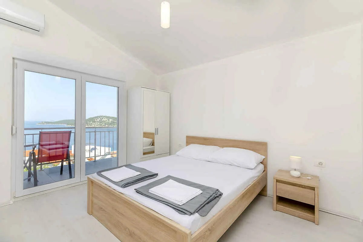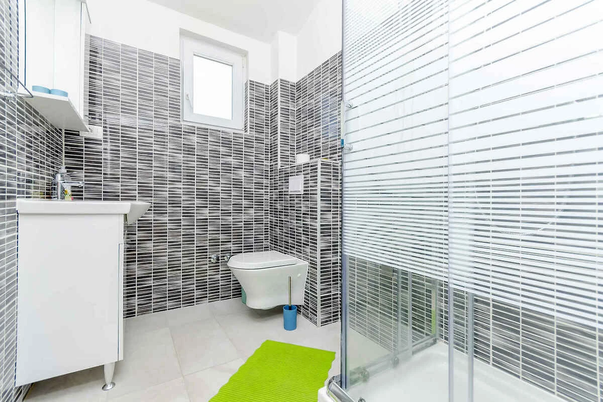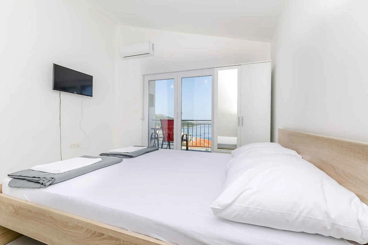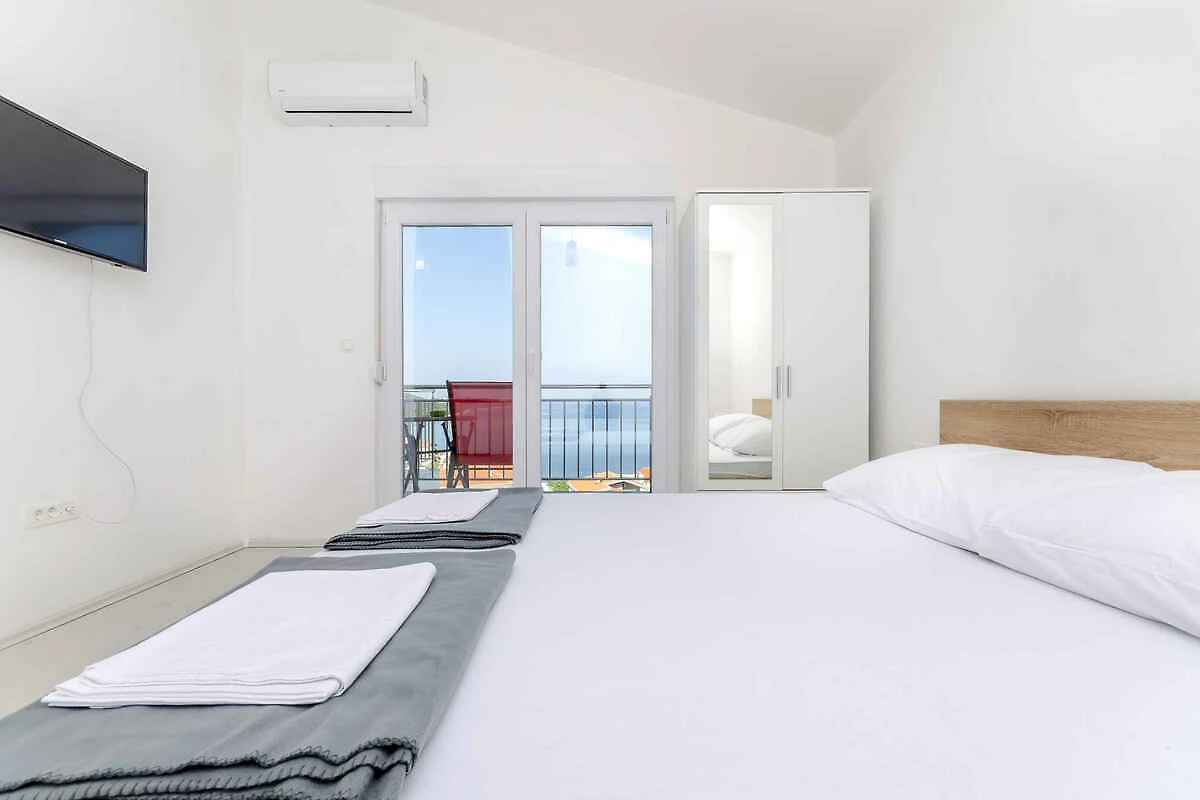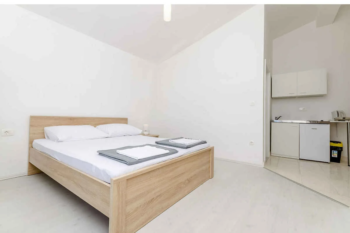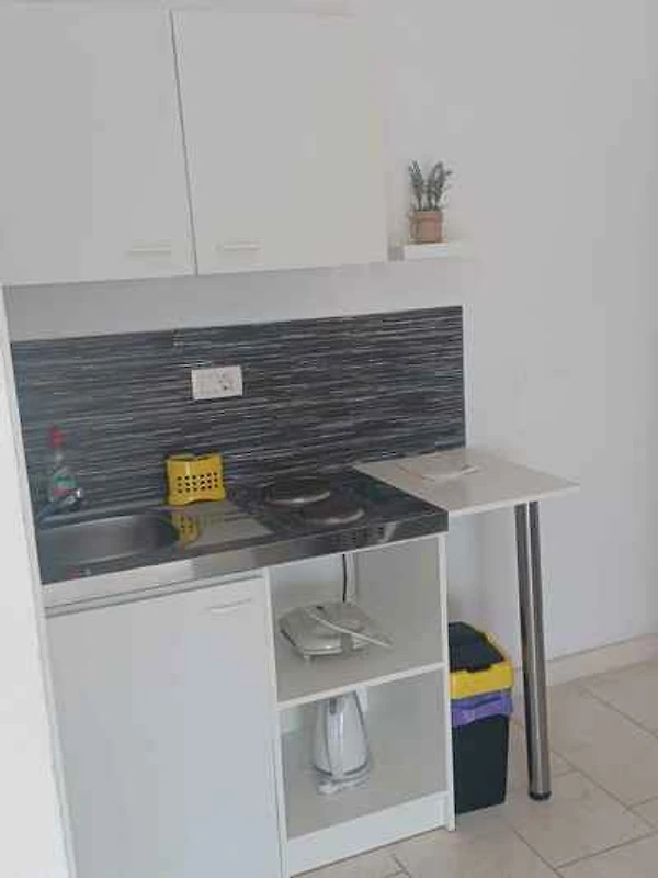 Lo studio si trova in un appartamento casa ed è arredato moderno. La proprietà si trova in una zona residenziale, in periferia. Anche a causa della vista dalla struttura sul mare e soleggiata posizione, il domicilio è popolare. Attrezzature: prato per prendere il sole, lettino da sole, possibilità di grigliare, terrazza e mobili da giardino.