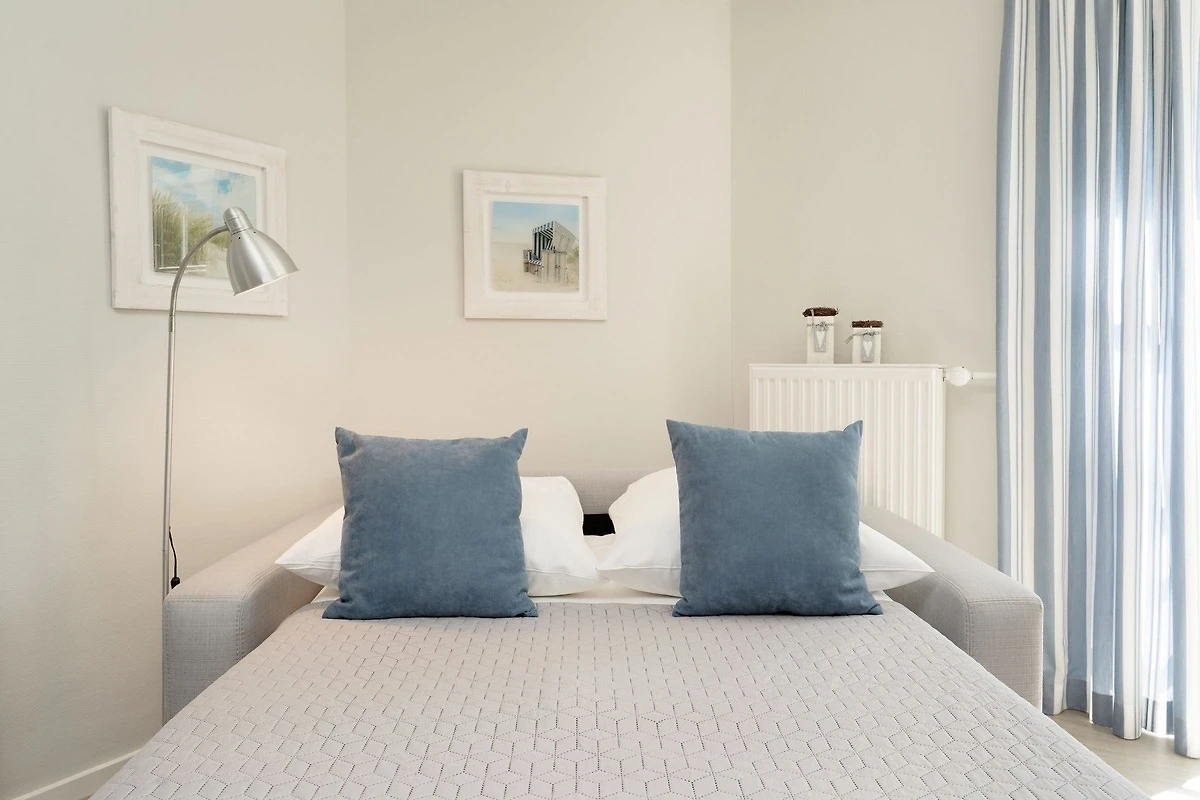 Schönes Design und Akzente wie Regendusche und komfortables Ausrollschlafsofa und Strandkorb am Strand inklusive sowie Fahrrädern im Keller.
