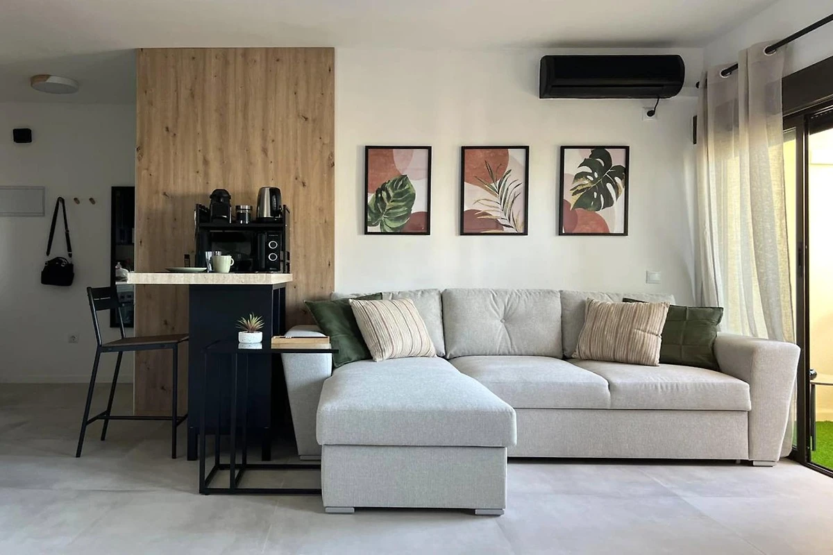 Benvenuti in questo moderno monolocale ad Aguadulce, il rifugio costiero perfetto per una vacanza rilassante. Progettato per offrire comfort e stile, dispone di una luminosa cucina a pianta aperta con tutti gli elettrodomestici e gli utensili necessari, un'accogliente zona soggiorno con divano e TV a schermo piatto e una camera da letto con letto matrimoniale e biancheria fresca. Il bagno in stile contemporaneo include una spaziosa doccia per la massima comodità.