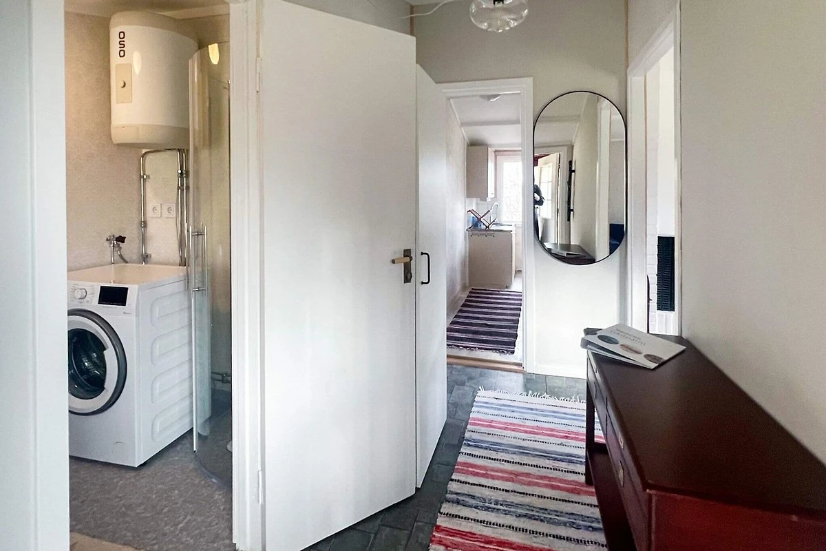 Cucina separata(mobile cucina(elettrico), cappa aspirante, caffettiera, forno a microonde, frigo con congelatore), Soggiorno/camera da letto(brandina doppia), Camera da letto(2x letto singolo), Bagno(lavabo, doccia, WC, lavatrice), riscaldamento(elettrico), termopompa aria-aria