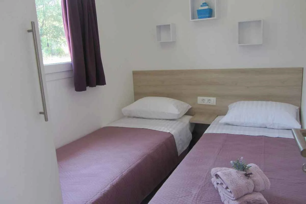 Soggiorno (camera di passaggio) con angolo di seduta, TV e zona pranzo. 2 camere da letto tutto a con 2 letti singoli. Camera da letto con 1 letto matrimoniale. Angolo cucina nel soggiorno con fornello elettrico, frigorifero, microonde, tostapane e bollitore elettrico. 2 bagni tutto a con doccia, WC e finestra.