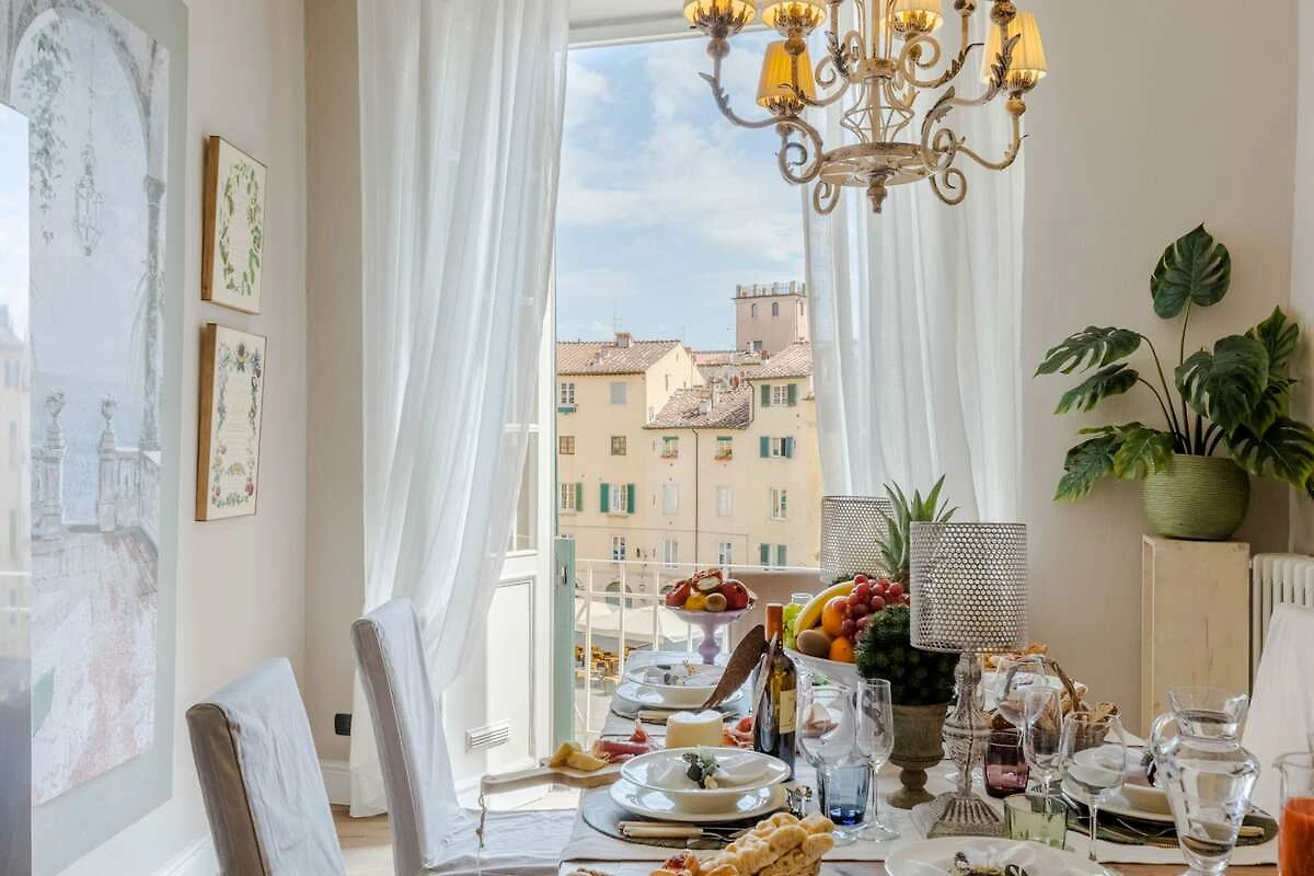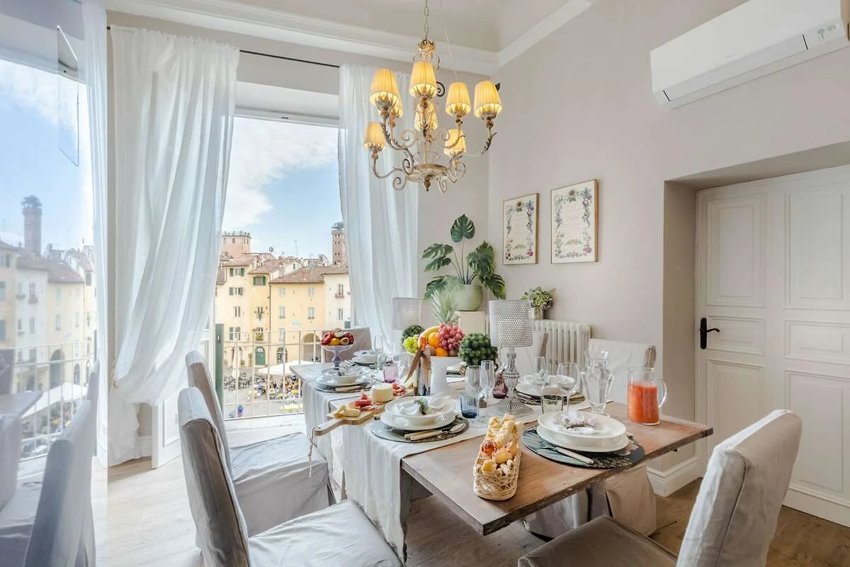 Inizia la tua mattinata in prima fila per assistere al risveglio di Lucca: sorseggia un espresso e goditi una colazione a buffet mentre il sole sorge sull'iconica Piazza Anfiteatro, ammirata dal tuo balcone privato al secondo piano. Da questa posizione esclusiva nel cuore della città, ammira le strade acciottolate animarsi sotto di te. Esci dalla tua elegante cucina e raggiungi un grazioso balcone per immergerti nell'energia di Via Fillungo e Piazza San Frediano, il principale quartiere dello shopping e della ristorazione di Lucca.