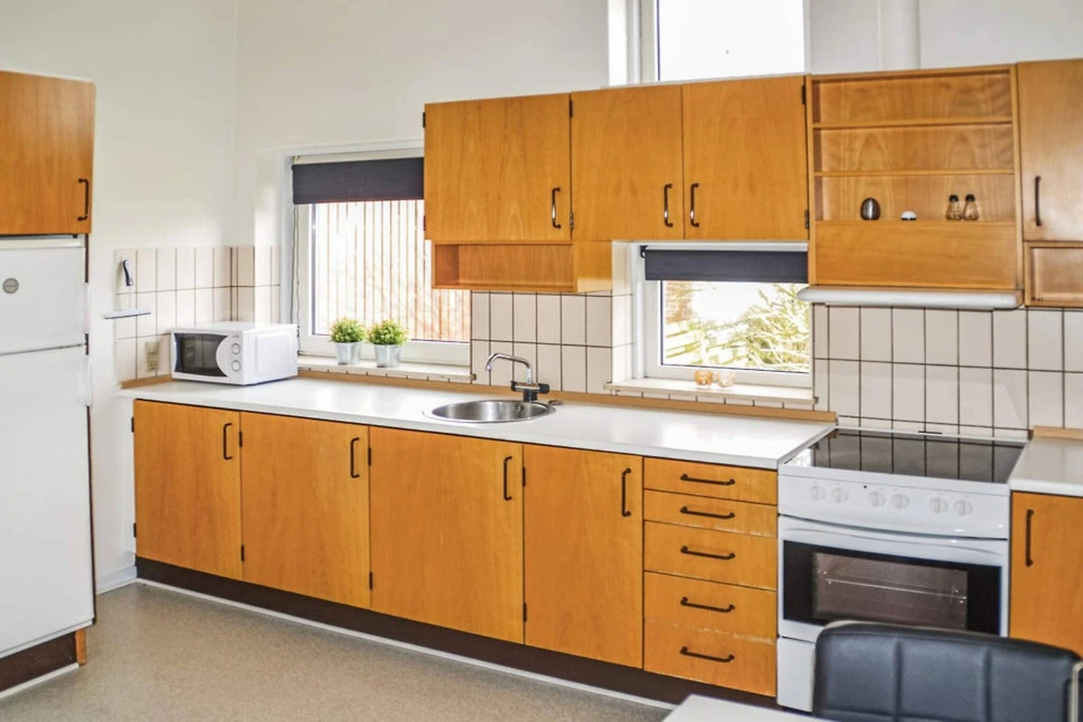 , Cucina separata(mobile cucina(elettrico), caffettiera, forno a microonde, frigorifero(+ congelatore), asciugabiancheria, lavatrice), Soggiorno/camera da letto(TV(canali televisivi tedeschi, canali TV danesi, canali TV norvegesi, canali TV svedesi), impianto stereo), Camera da letto(letto matrimoniale), Camera da letto(2x letto singolo), Bagno(lavabo, doccia, WC), terrazza, mobili da giardino, piscina(in comune con altri ospiti, all’interno)