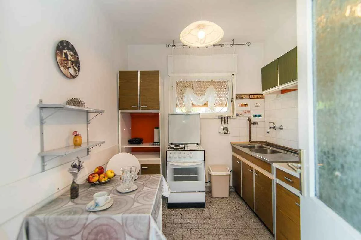 Novi Vinodolski. L' appartamento vacanze si trova in una trama del giardino chiuso con prato, fiori e alberi, delimitata da una recinzione. L'accesso avviene vicino a una strada secondaria (asfaltata). Parcheggio sulla proprietà.
