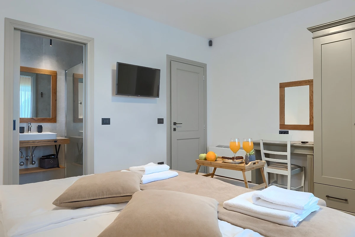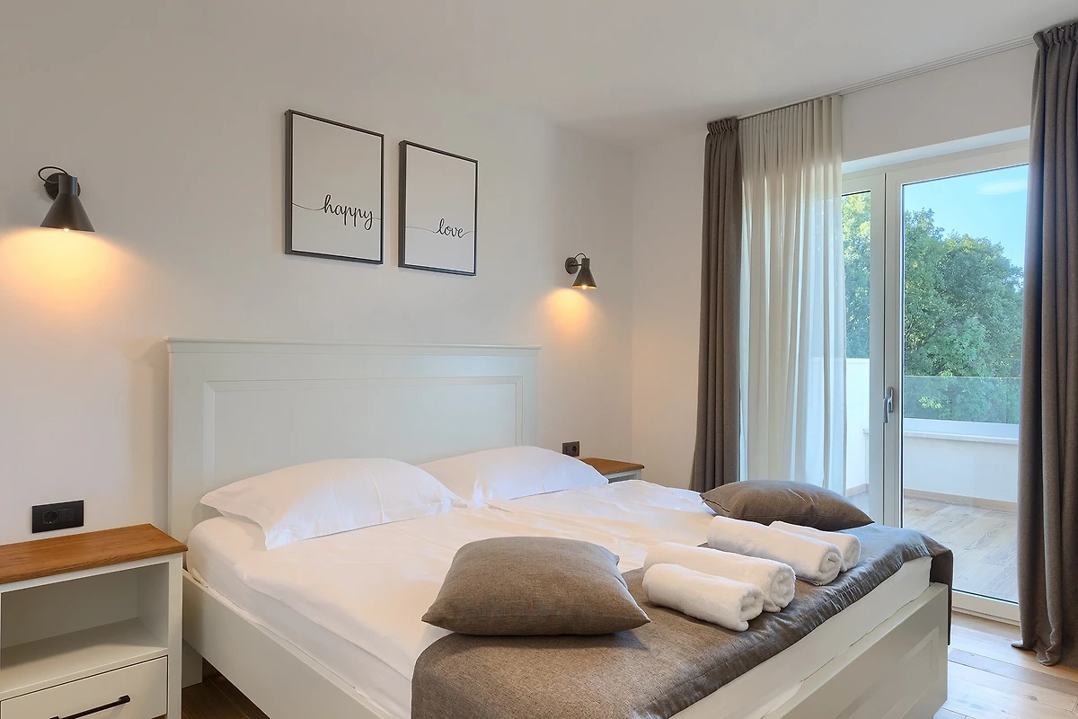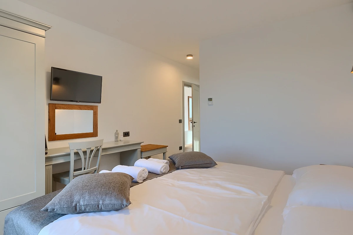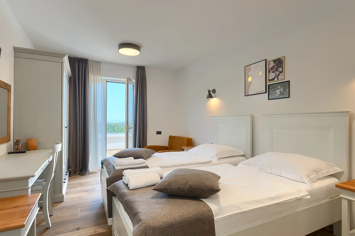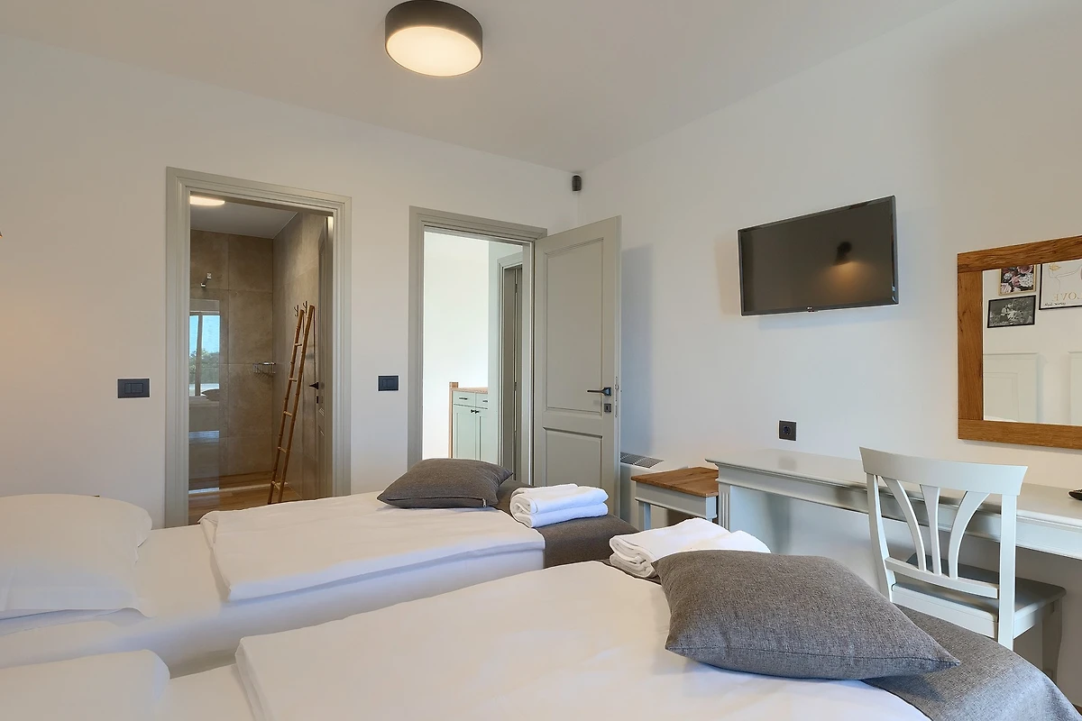Al piano terra di Villa Grgo si trovano due delle quattro camere da letto e due bagni. Le restanti due camere da letto e due bagni si trovano al primo piano della villa. Le camere da letto, oltre al letto matrimoniale, contengono anche una scrivania, un televisore e un armadio. Una particolarità è il balcone al secondo piano, che collega le due camere da letto e contiene un piccolo angolo per riposare e godersi il panorama. Ciascuno dei quattro bagni privati è dotato di cabina doccia, lavandino e wc. Ogni bagno è dotato di riscaldamento a pavimento e, oltre agli asciugacapelli, sono disponibili anche prodotti per l'igiene personale.
