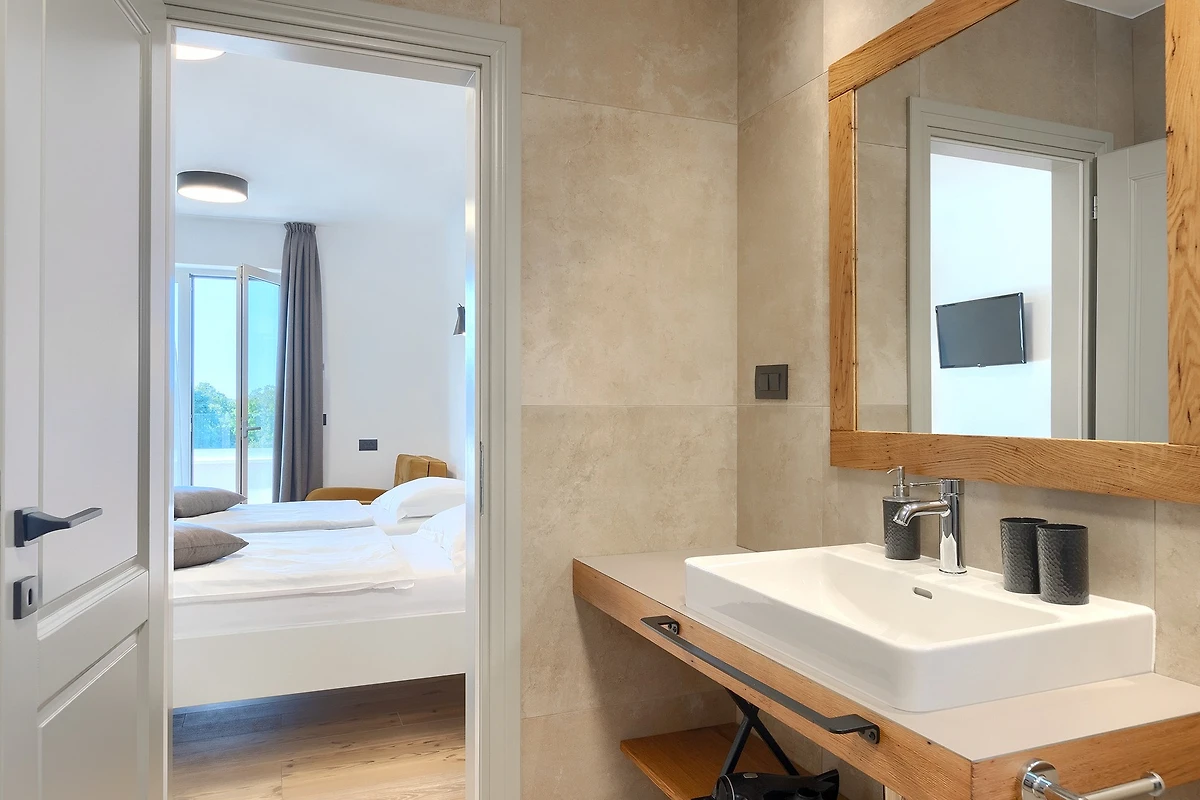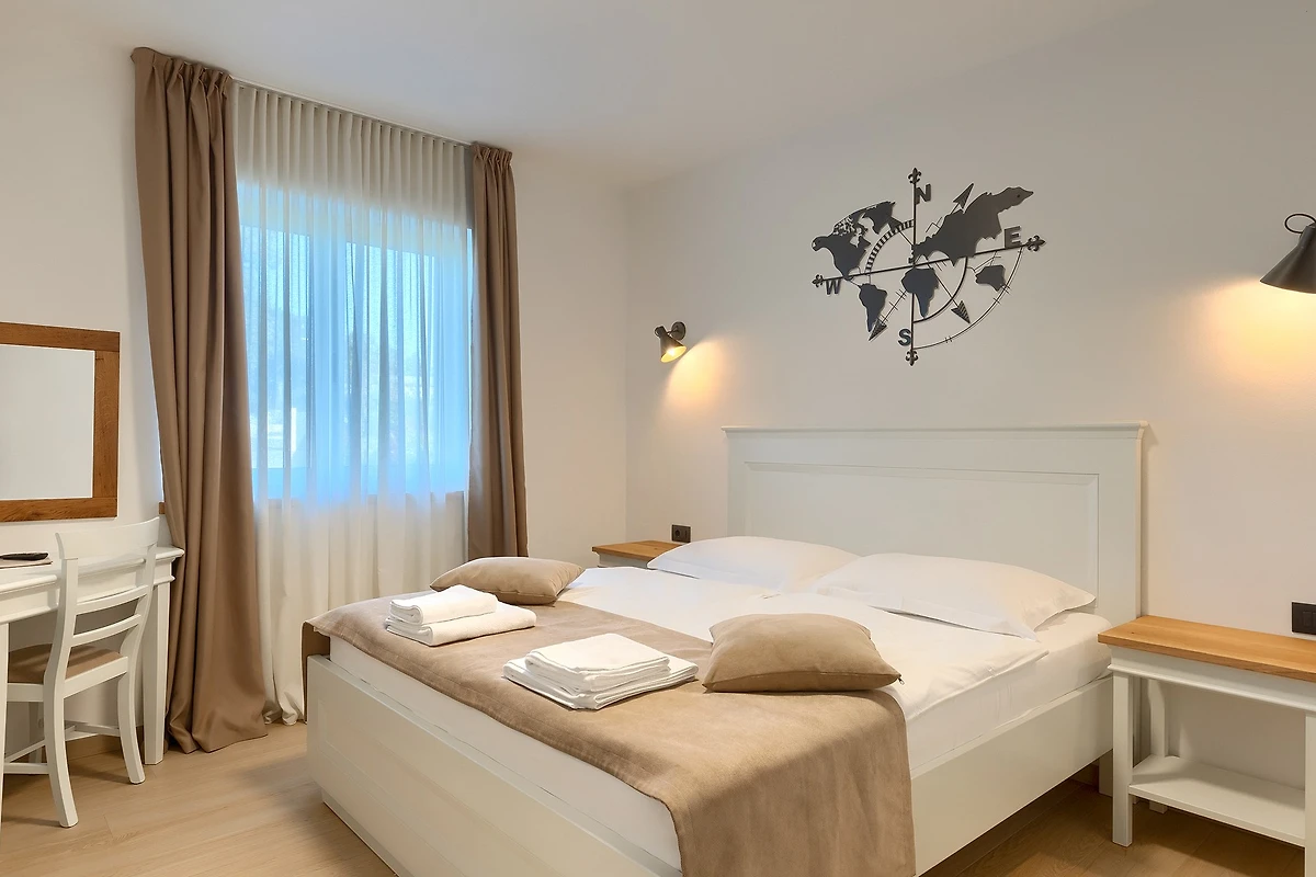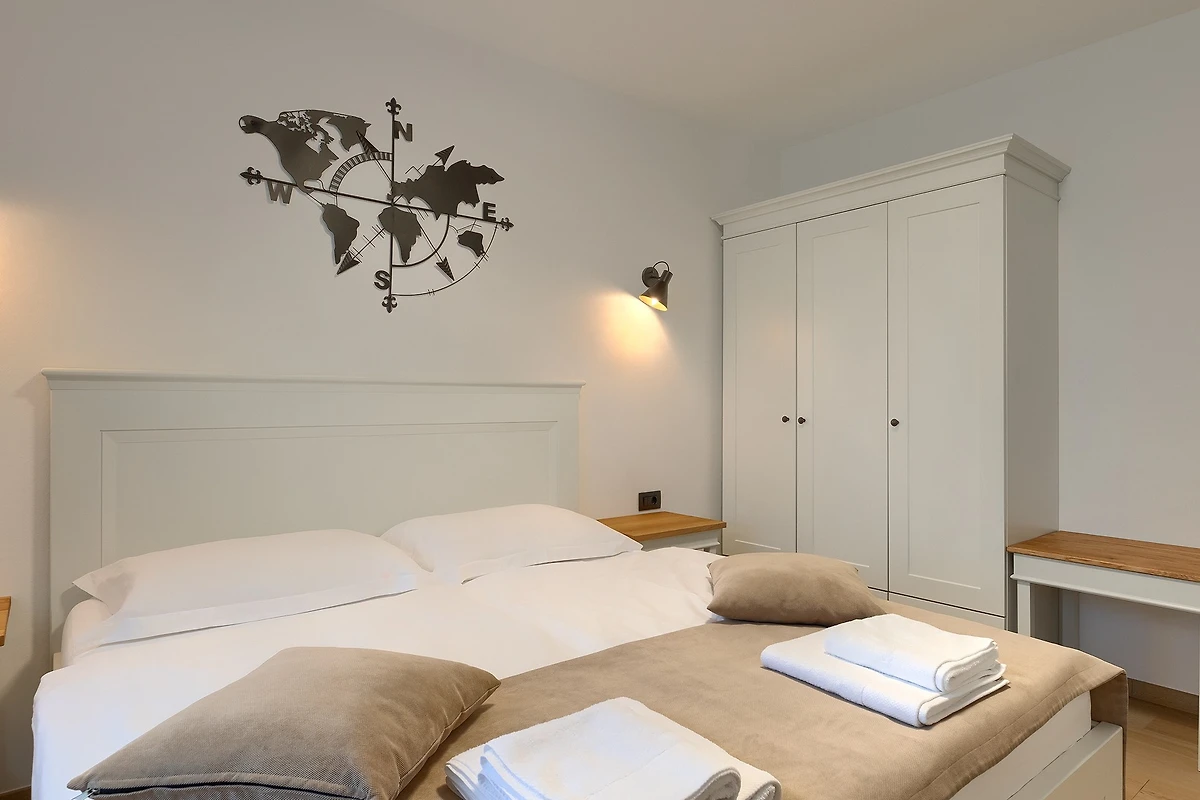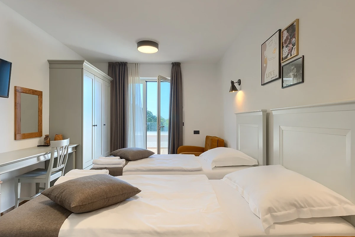 Al piano terra di Villa Grgo si trovano due delle quattro camere da letto e due bagni. Le restanti due camere da letto e due bagni si trovano al primo piano della villa. Le camere da letto, oltre al letto matrimoniale, contengono anche una scrivania, un televisore e un armadio. Una particolarità è il balcone al secondo piano, che collega le due camere da letto e contiene un piccolo angolo per riposare e godersi il panorama. Ciascuno dei quattro bagni privati è dotato di cabina doccia, lavandino e wc. Ogni bagno è dotato di riscaldamento a pavimento e, oltre agli asciugacapelli, sono disponibili anche prodotti per l'igiene personale.