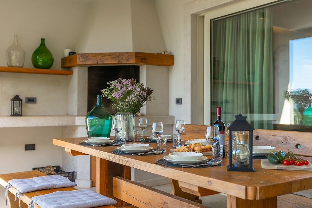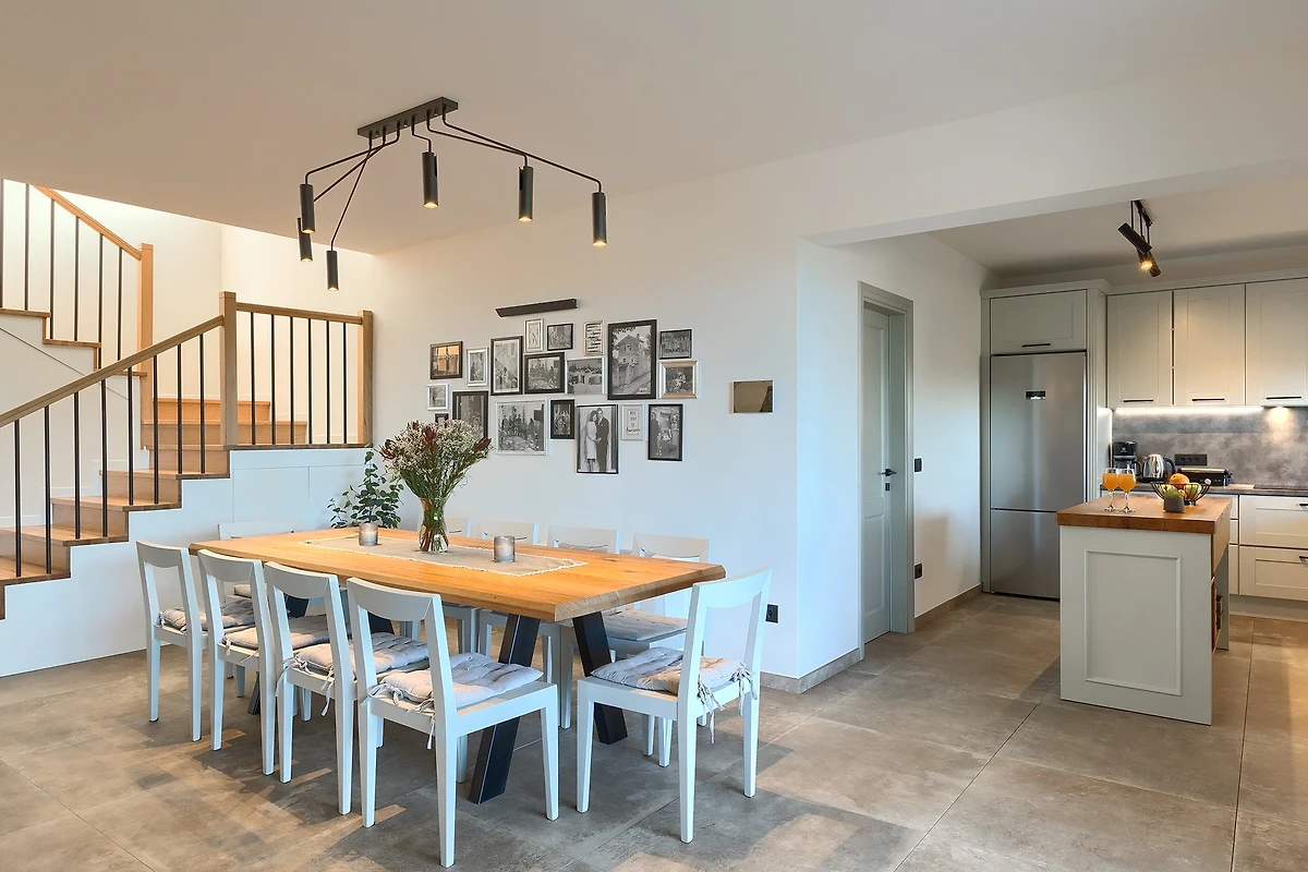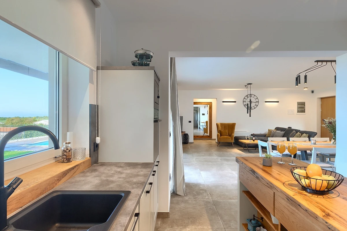 Il soggiorno estremamente spazioso si trova al piano terra di Villa Grgo. Una grande porta a vetri lascia entrare la luce del sole e offre una vista rilassante sul cortile e sulla piscina. Accanto al comodo divano ad angolo c'è un grande tavolo da pranzo in legno con sedie per 10 persone. Nel prolungamento della stanza, c'è una cucina bianca semplice ma elegante con isola cucina. Elettrodomestici come un grande frigorifero, un forno, una lavastoviglie e un forno a microonde di alta qualità contribuiscono al comfort del vostro soggiorno.
