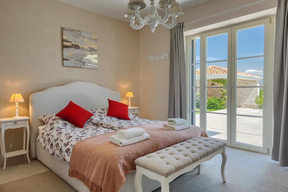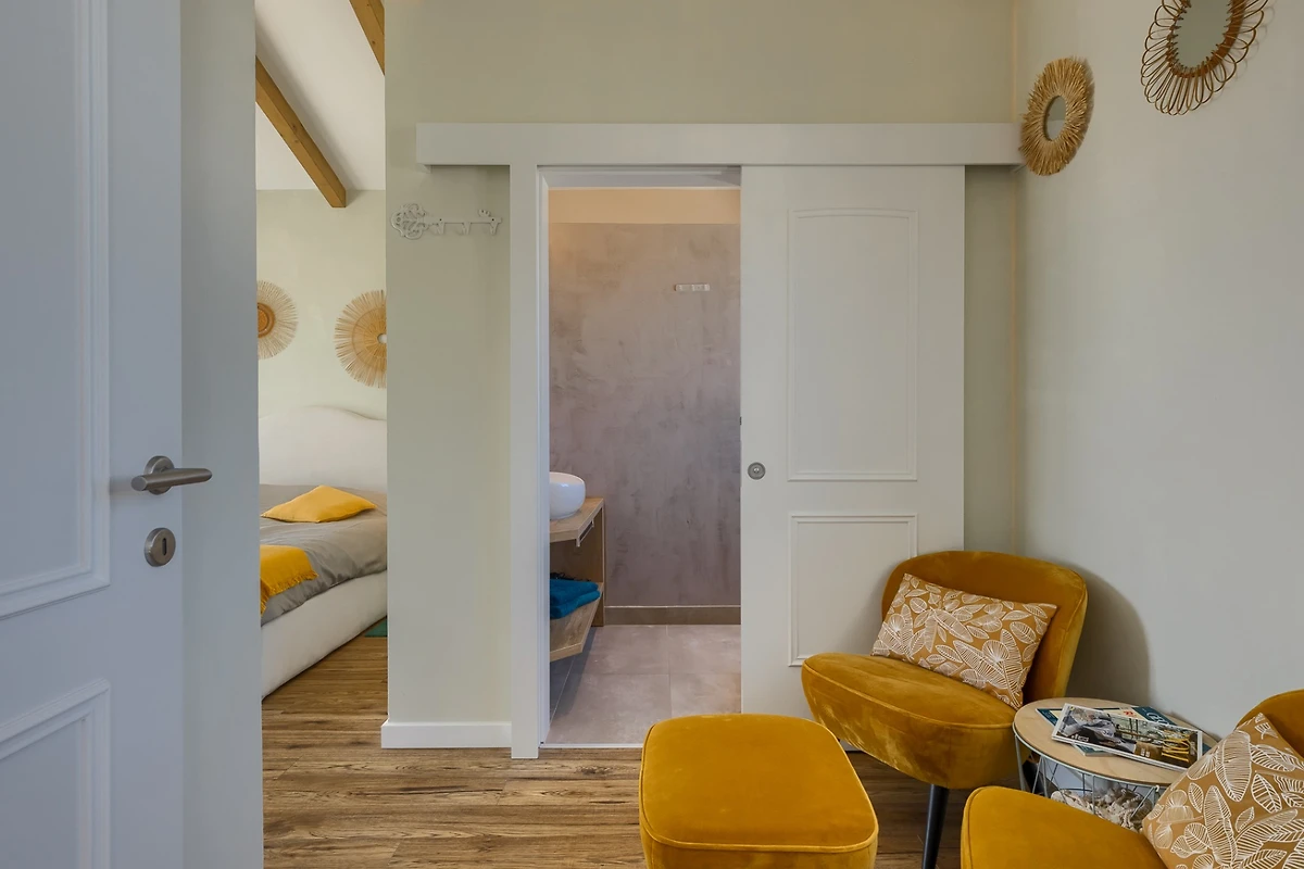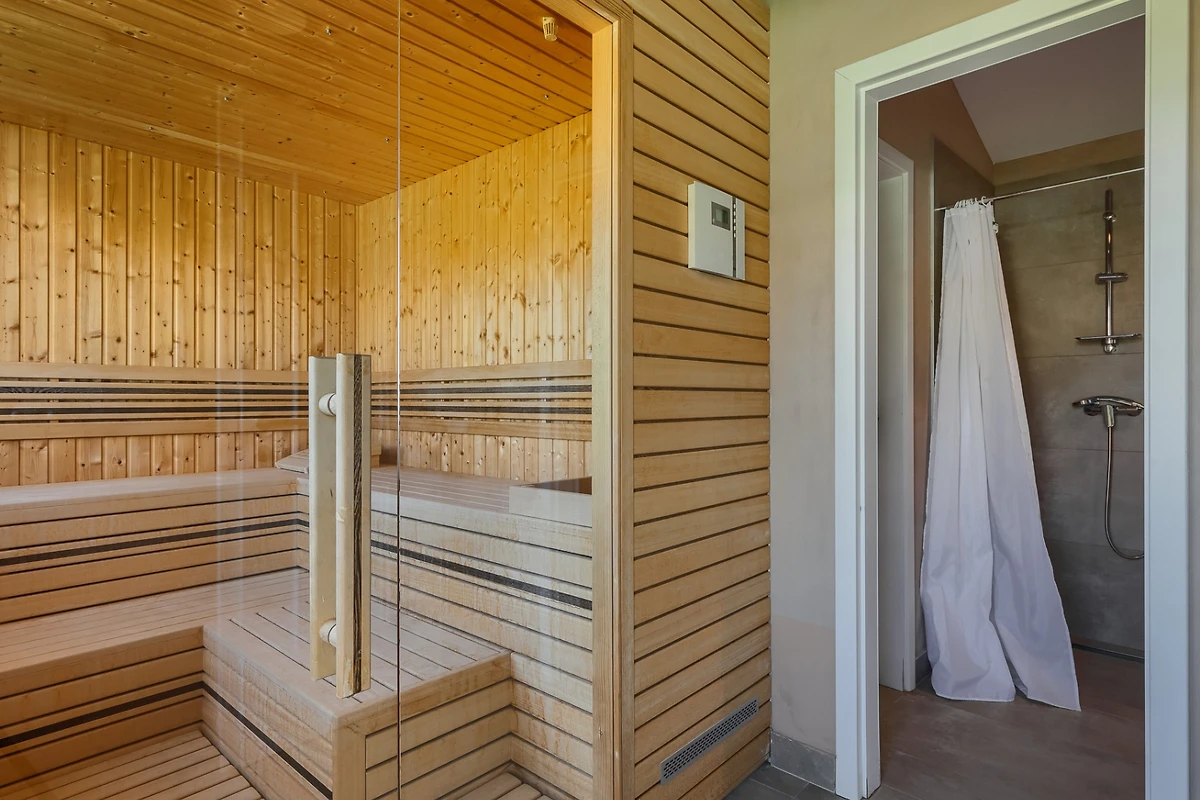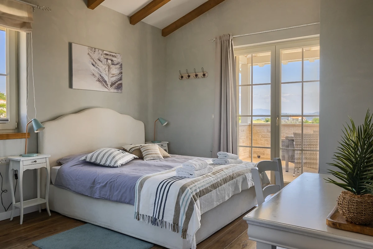 Le camere da letto sono distribuite sui piani, 1 al piano inferiore e le altre 5 al piano superiore. Ogni camera da letto ha il proprio bagno privato e tutte le stanze e i bagni sono dotati di riscaldamento a pavimento. Ancora una volta, il tema è quello dell'ariosità e dei toni neutri e piacevoli. Ogni camera da letto ha porte-finestre che conducono alla terrazza. In questo modo ogni ospite può godersi la vista dall'intimità della propria stanza. Le camere al piano superiore condividono una terrazza coperta comune, arredata con diversi tavoli e sedie. I bagni sono progettati in stile minimalista e moderno. Ognuno di essi dispone di una cabina doccia, mentre il bagno al piano terra è dotato sia di doccia che di vasca.